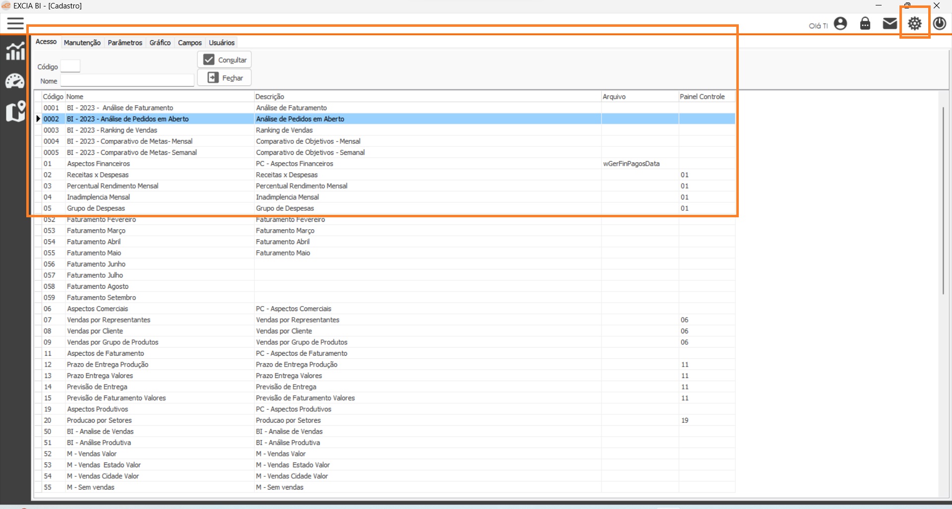 No canto superior direito na tela principal do BI esta localizado botão em forma de engrenagem qual é possível de configurar os BI de acordo com a necessidade do cliente.