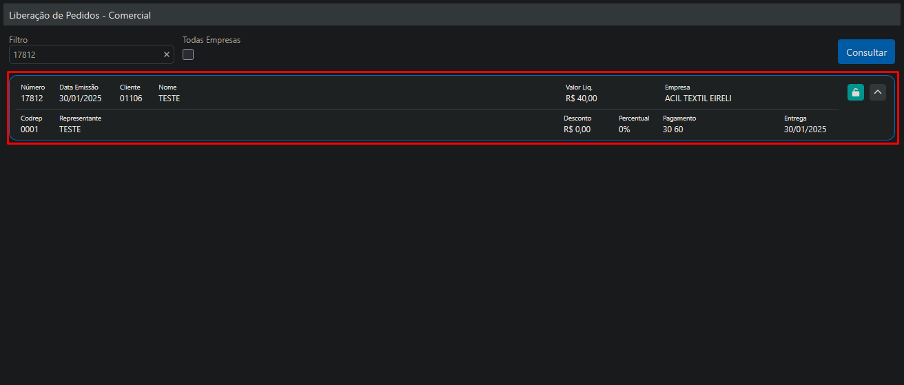 - Também está disponível o botão Liberar, que permite realizar a liberação do pedido no status comercial.