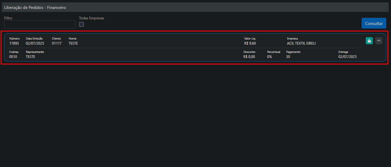 - Também está disponível o botão Liberar, que permite realizar a liberação do pedido no status financeiro.