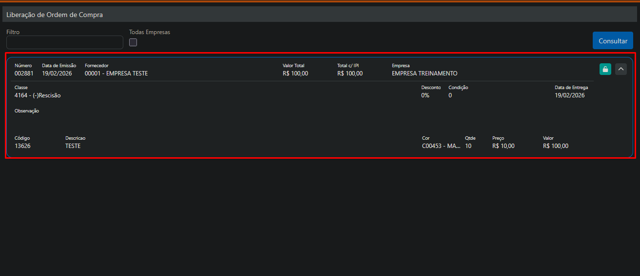 • Todas as empresas: Ao marcar essa opção, a consulta passa a considerar ordens de compra de todas as empresas cadastradas na base de dados.