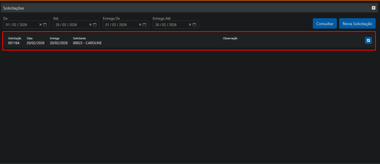 - Consultar: Realiza a consulta das solicitações conforme os filtros informados na tela.