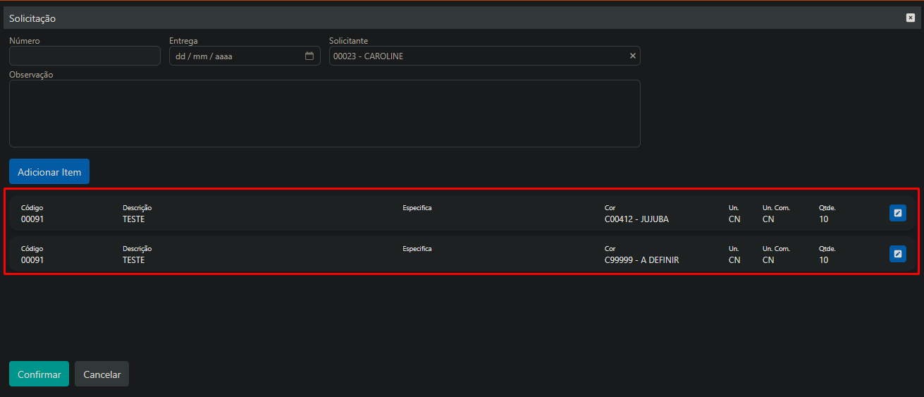 - Solicitante: Define o colaborador responsável pela solicitação.
