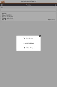 Ao Incluir um novo pedido, é necessário que a carga esteja baixada e atualizada (opção de Atualizar Carga), juntamente com os Clientes (Atualizar Clientes), estoque (Atualizar Estoque) e imagens (Atualizar Imagens) para o processo de emissão do Pedido.