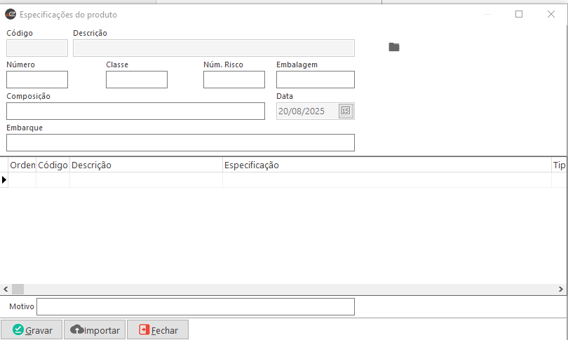 • Motivo: Permite informar um motivo no cadastro da especificação do produto.