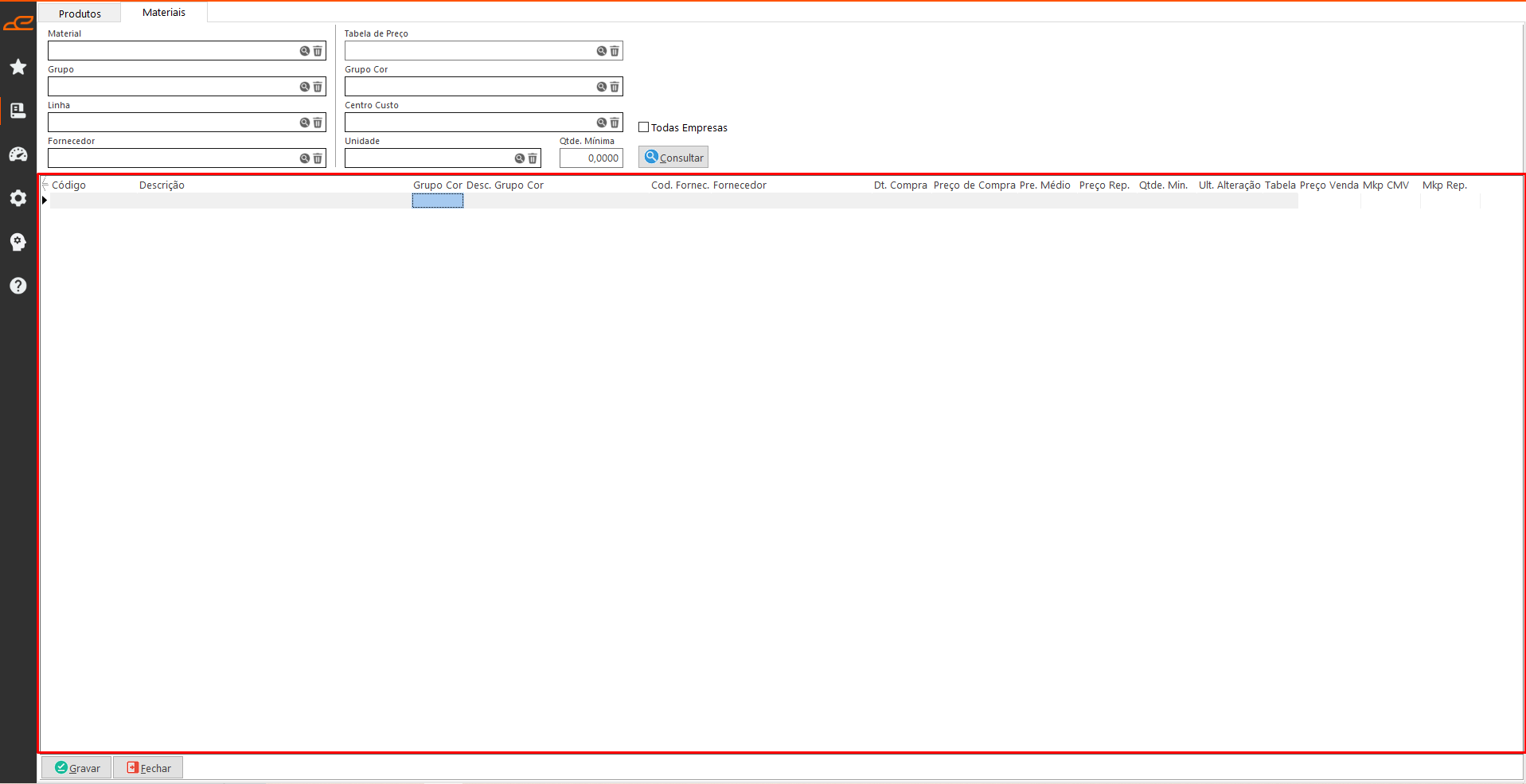 - Todas Empresas: Permite consultar os materiais cadastrados em todas as empresas do sistema.