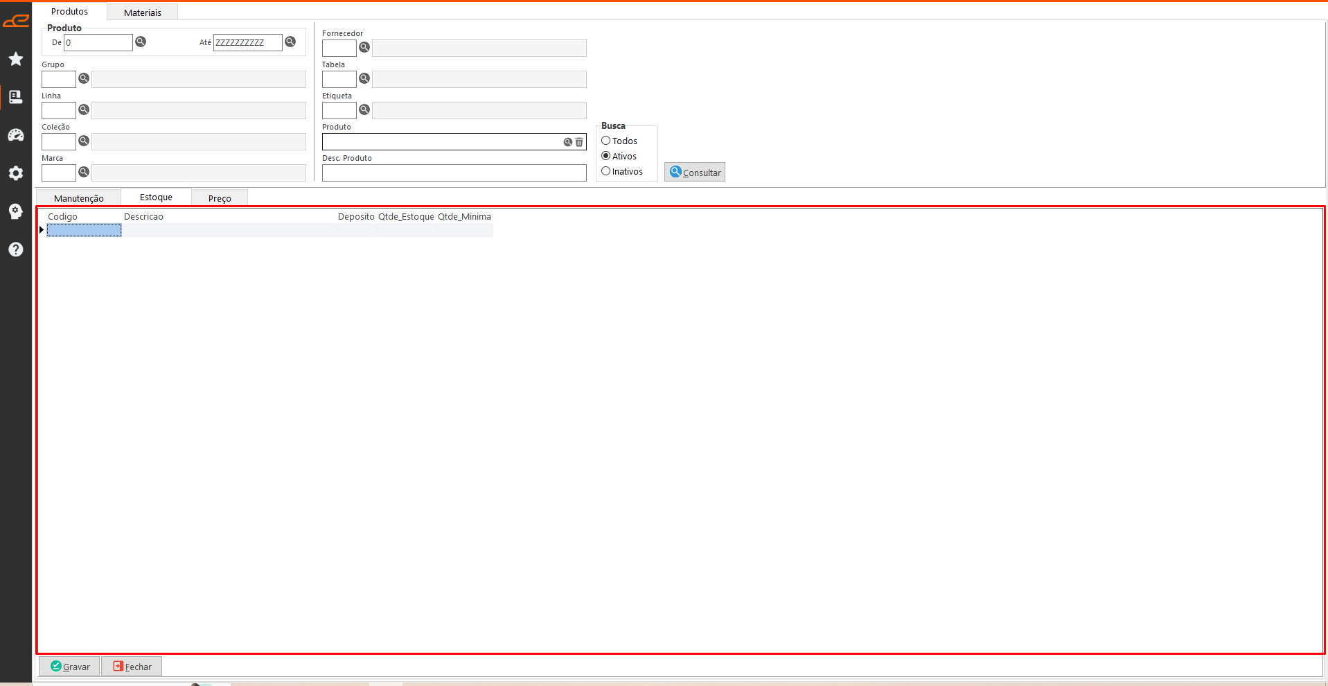 - Estoque: Esta tabela exibe as informações disponíveis sobre o estoque e permite configurar uma quantidade mínima para reposição.