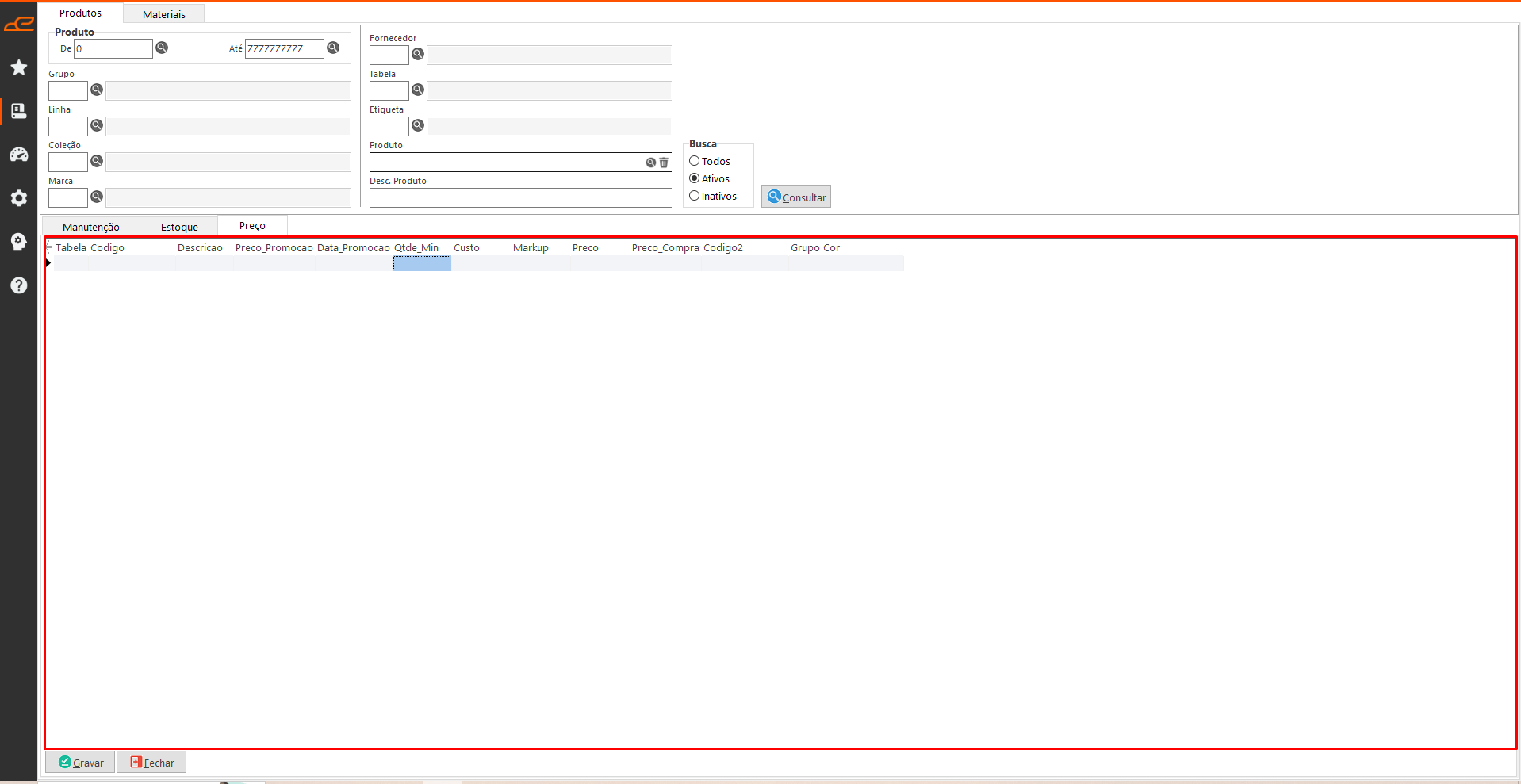 - Preço: Esta tabela exibe informações referentes ao preço e custo do produto e permite fazer alterações necessárias.