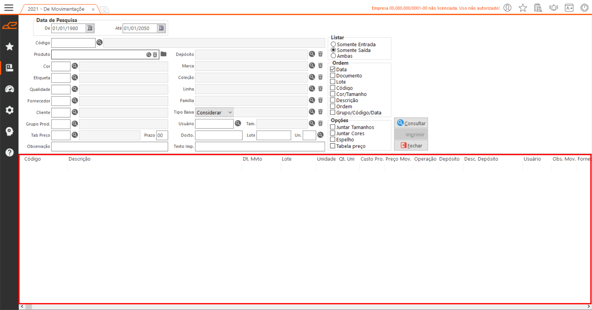 - Listar: Define qual o tipo de movimentação será exibido na consulta.