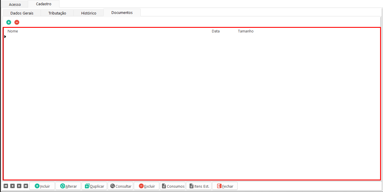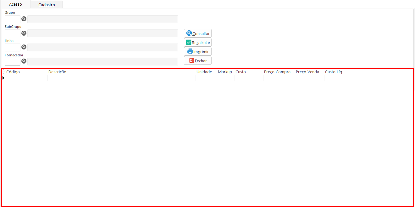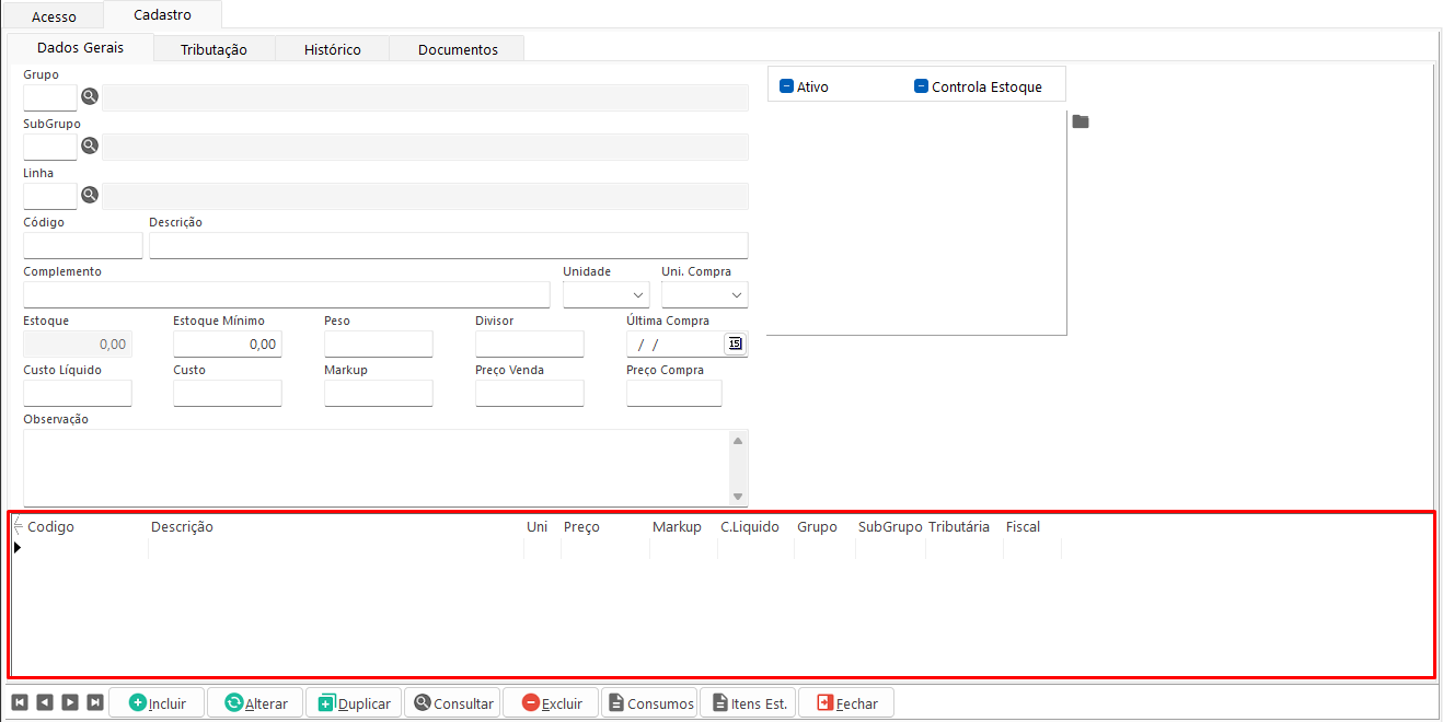 • Acesso: Exibe as informações dos materiais. Ao dar um duplo clique sobre um registro, os dados são transferidos para a aba Cadastros.