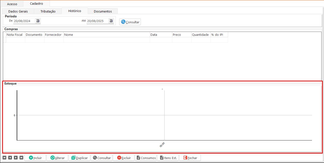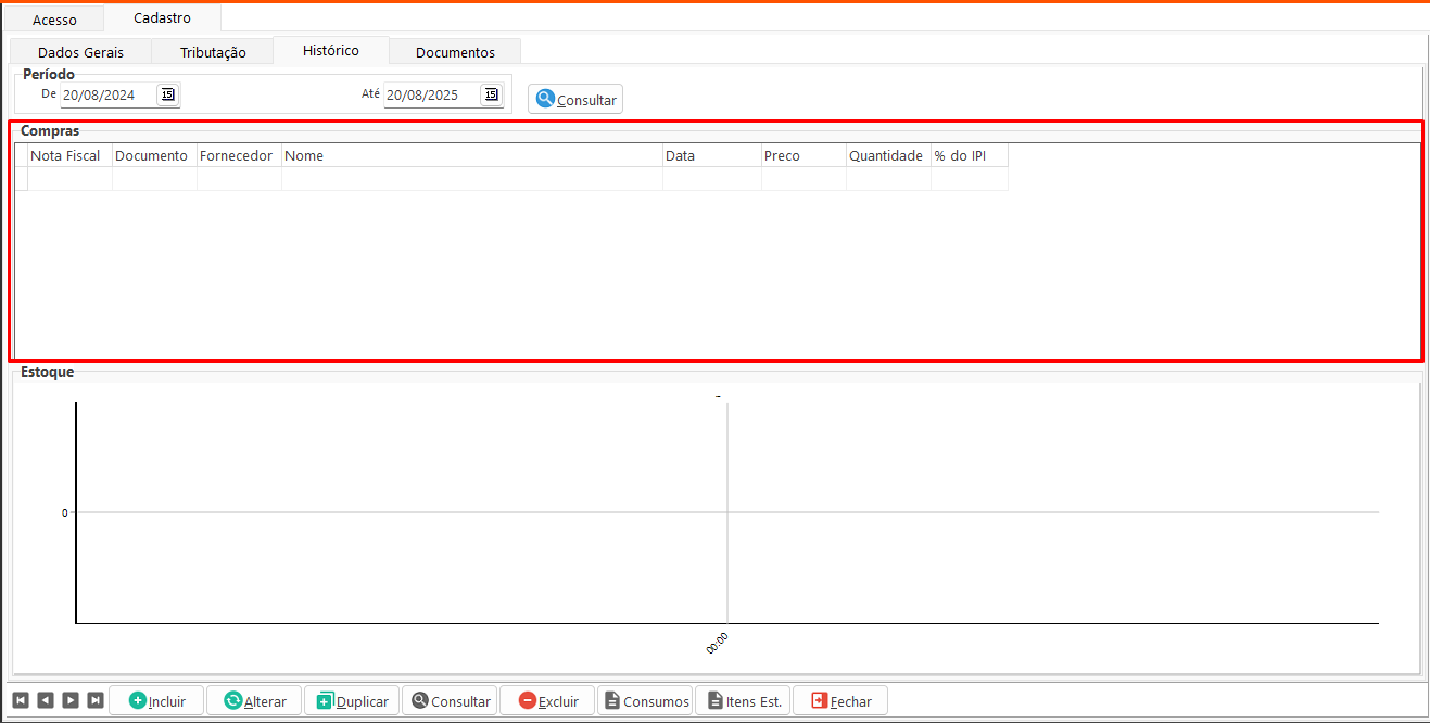 Nesta aba é possível consultar o histórico de compras e movimentações de estoque do material.