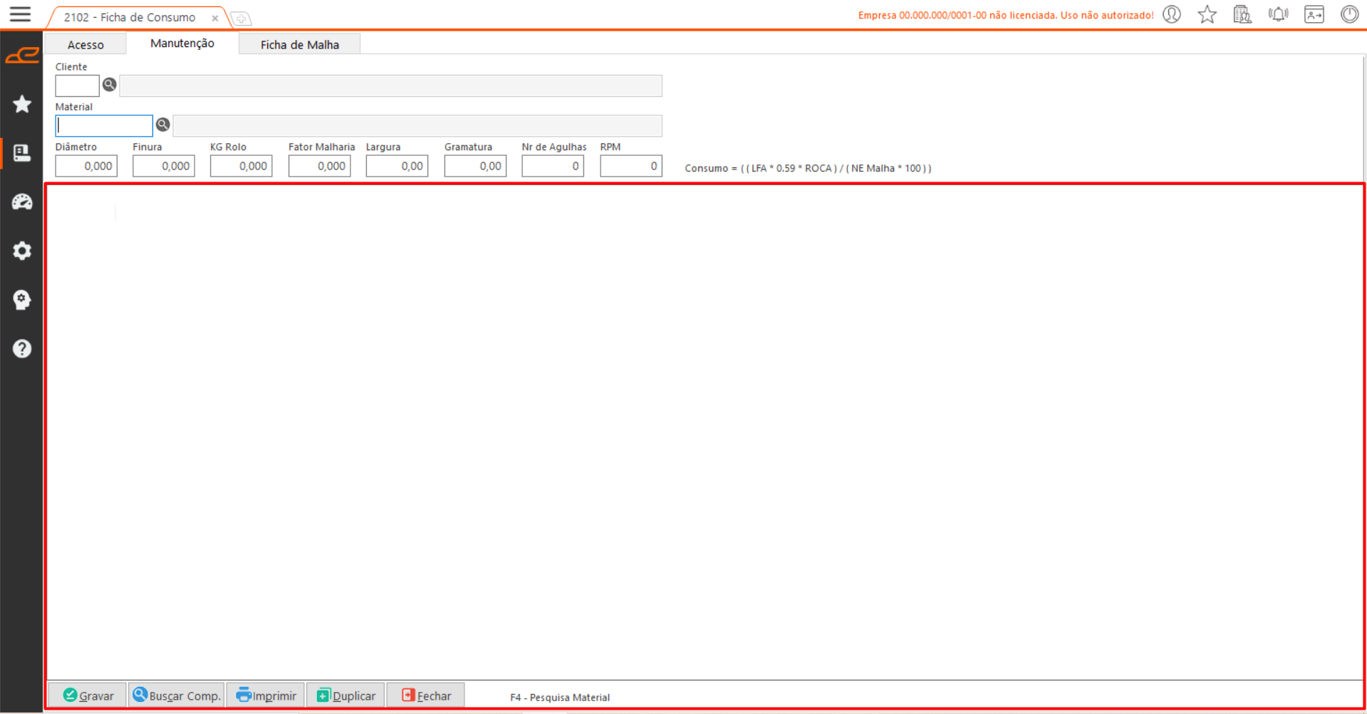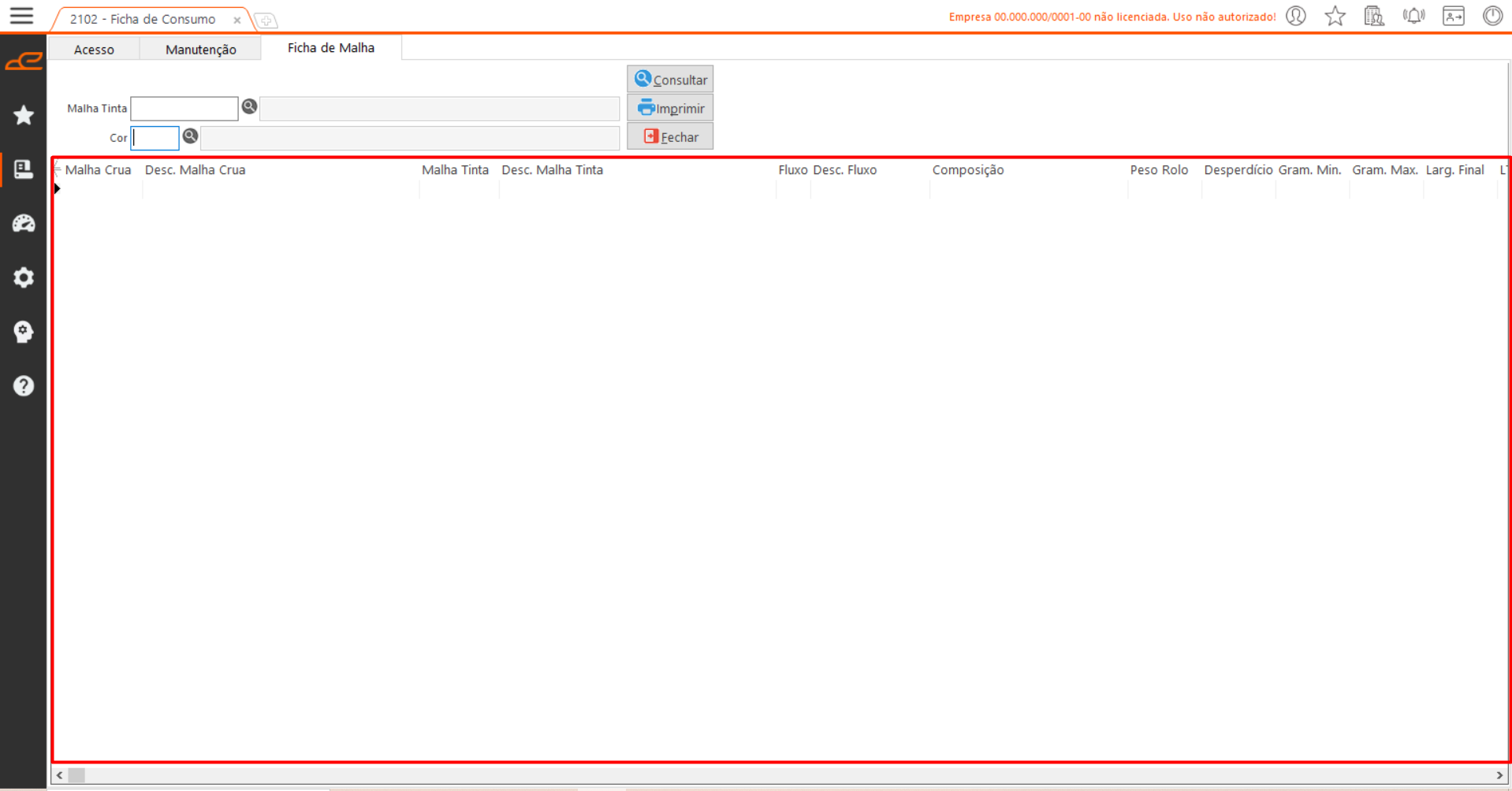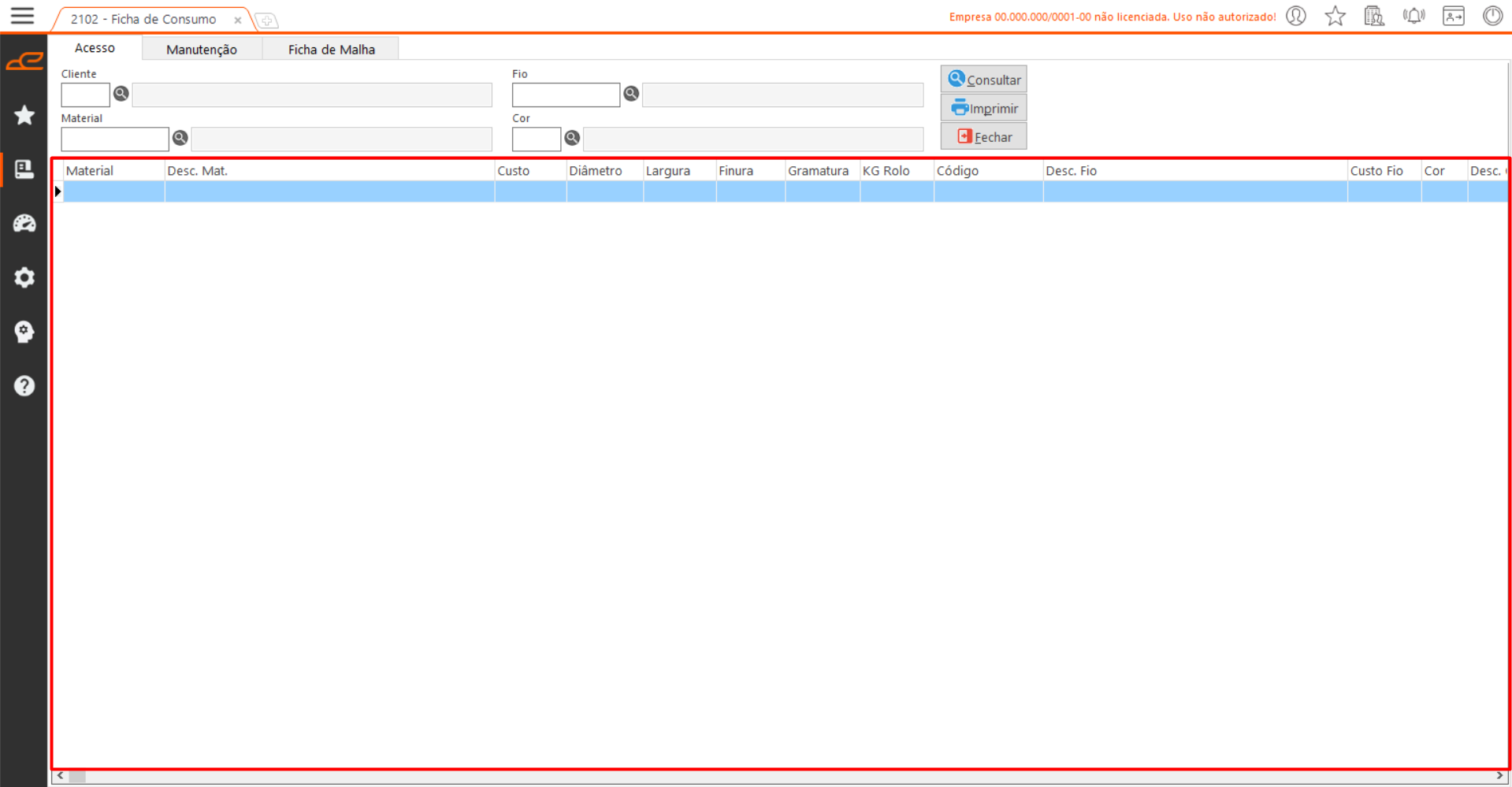 Nesta aba, é possível consultar fichas de consumo previamente registradas e imprimir um relatório com a composição da malha.