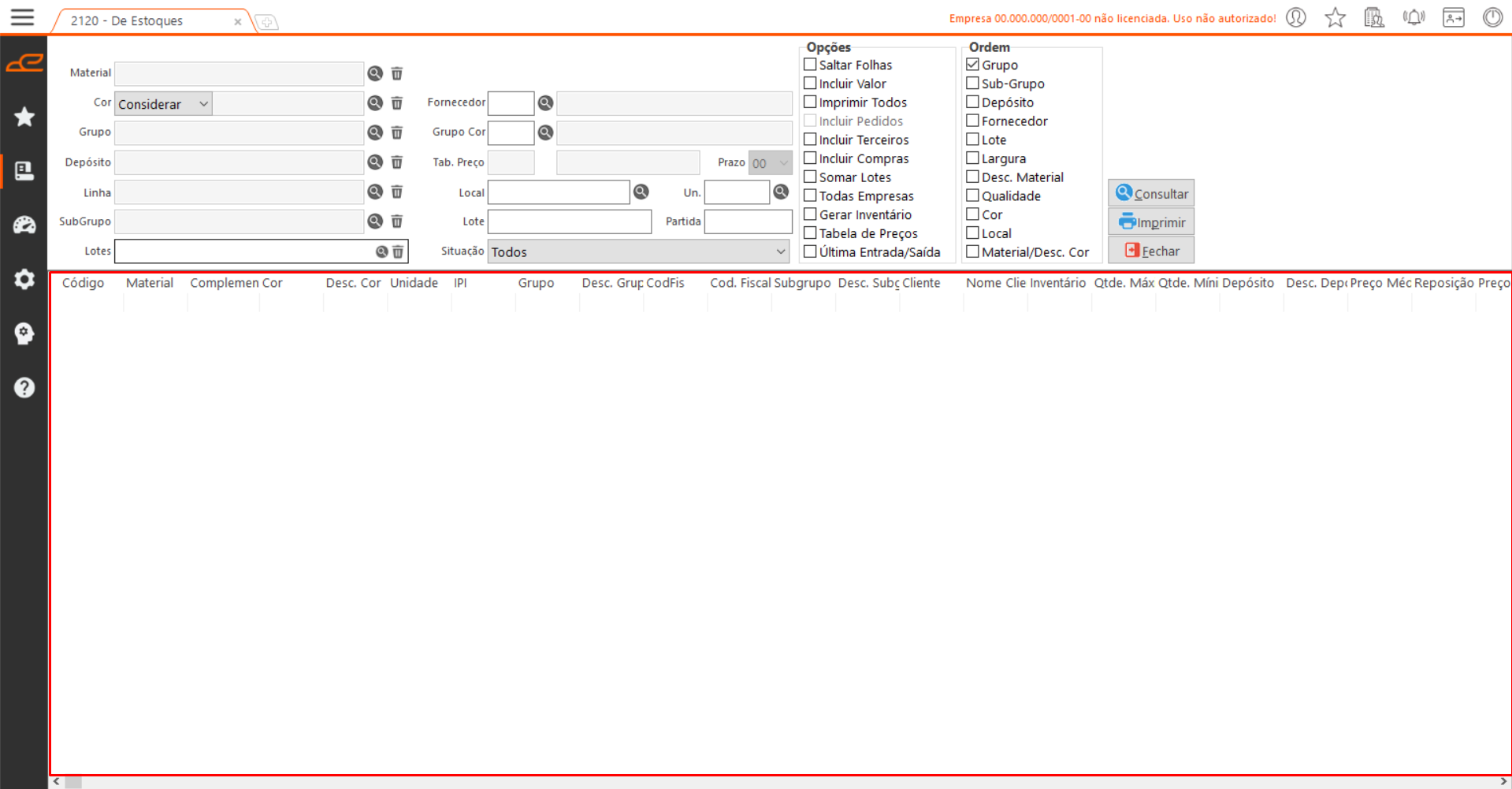 • Imprimir Todos: Configura a consulta para listar materiais cujo estoque encontra-se zerado.