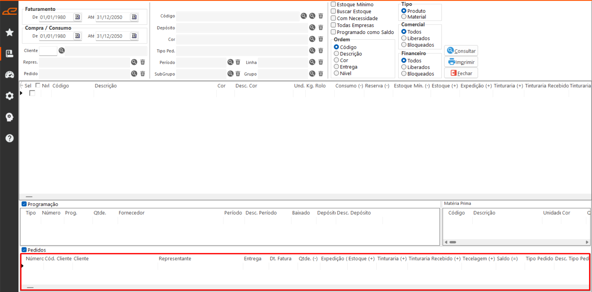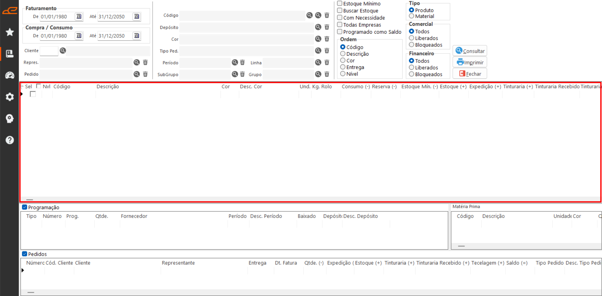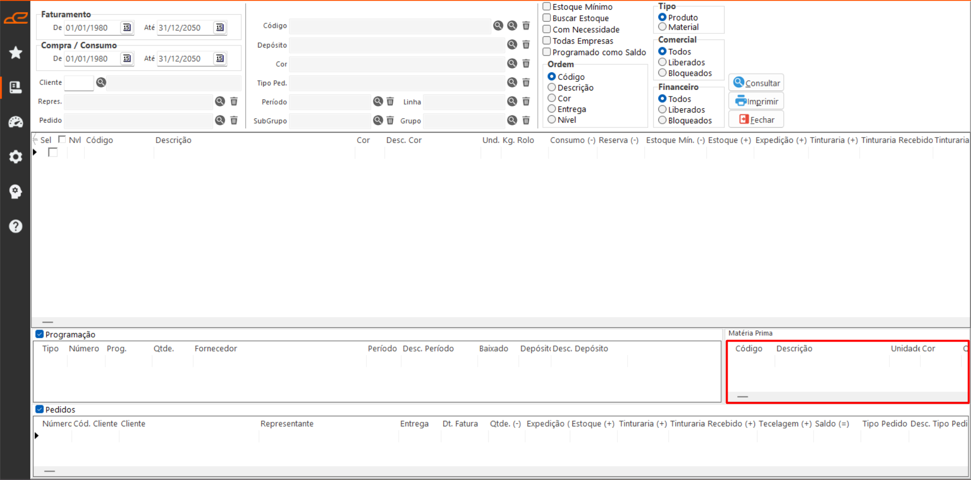 - Matéria Prima: Esta tabela exibe a matéria prima referente a programação selecionada na tabela programação.