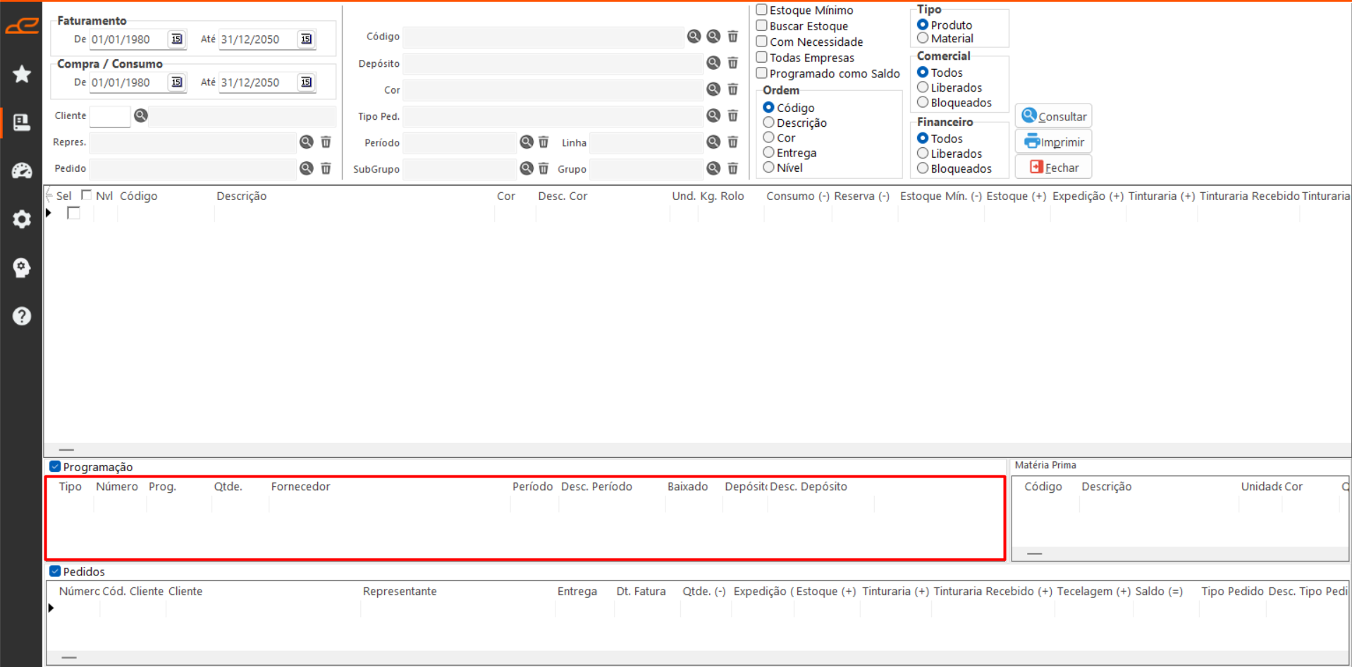 - Programação: Esta tabela exibe as programações referentes ao item selecionado na tabela principal.