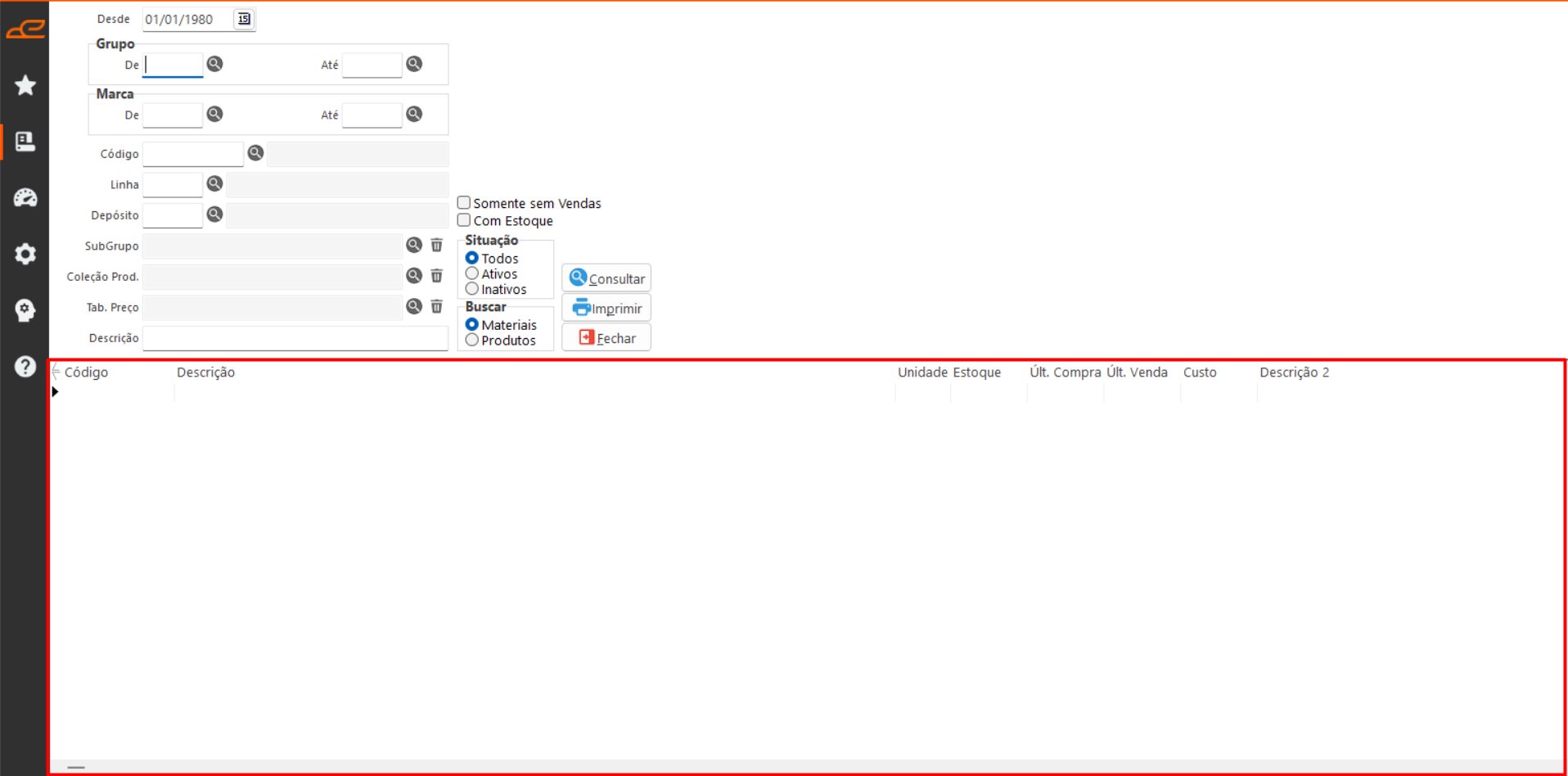 • Consultar: Executa a consulta conforme os filtros informados, para itens que não foram movimentados.