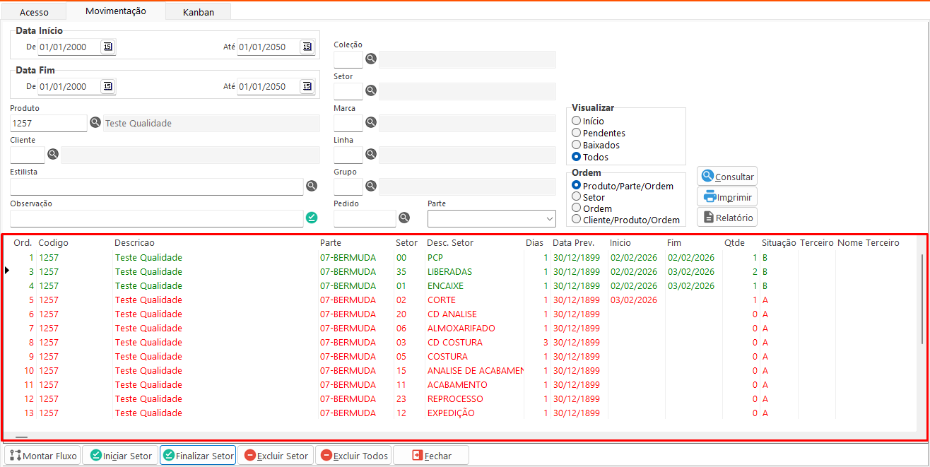 - Movimentação: Nesta tabela são exibidos os setores do fluxo de desenvolvimento do produto. Os setores pendentes aparecem em vermelho e os setores finalizados em verde.