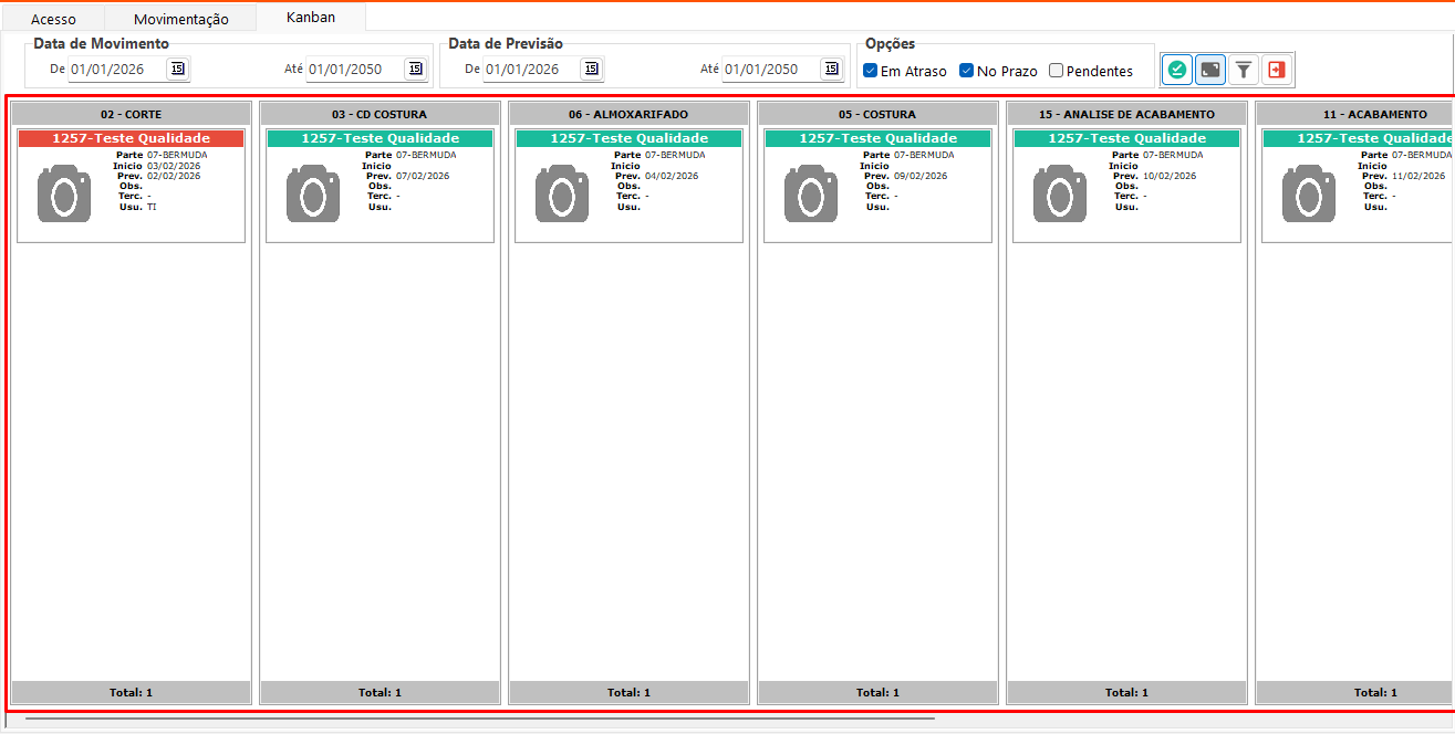 - Kanban: Exibe os setores de uma movimentação no formato Kanban, mostrando as informações da movimentação e as fotos do produto. O nome do produto é exibido em verde quando está dentro do prazo e em vermelho quando há atraso. A quantidade de produtos é apresentada para cada setor, e é possível visualizar a foto do produto ao clicar no registro.