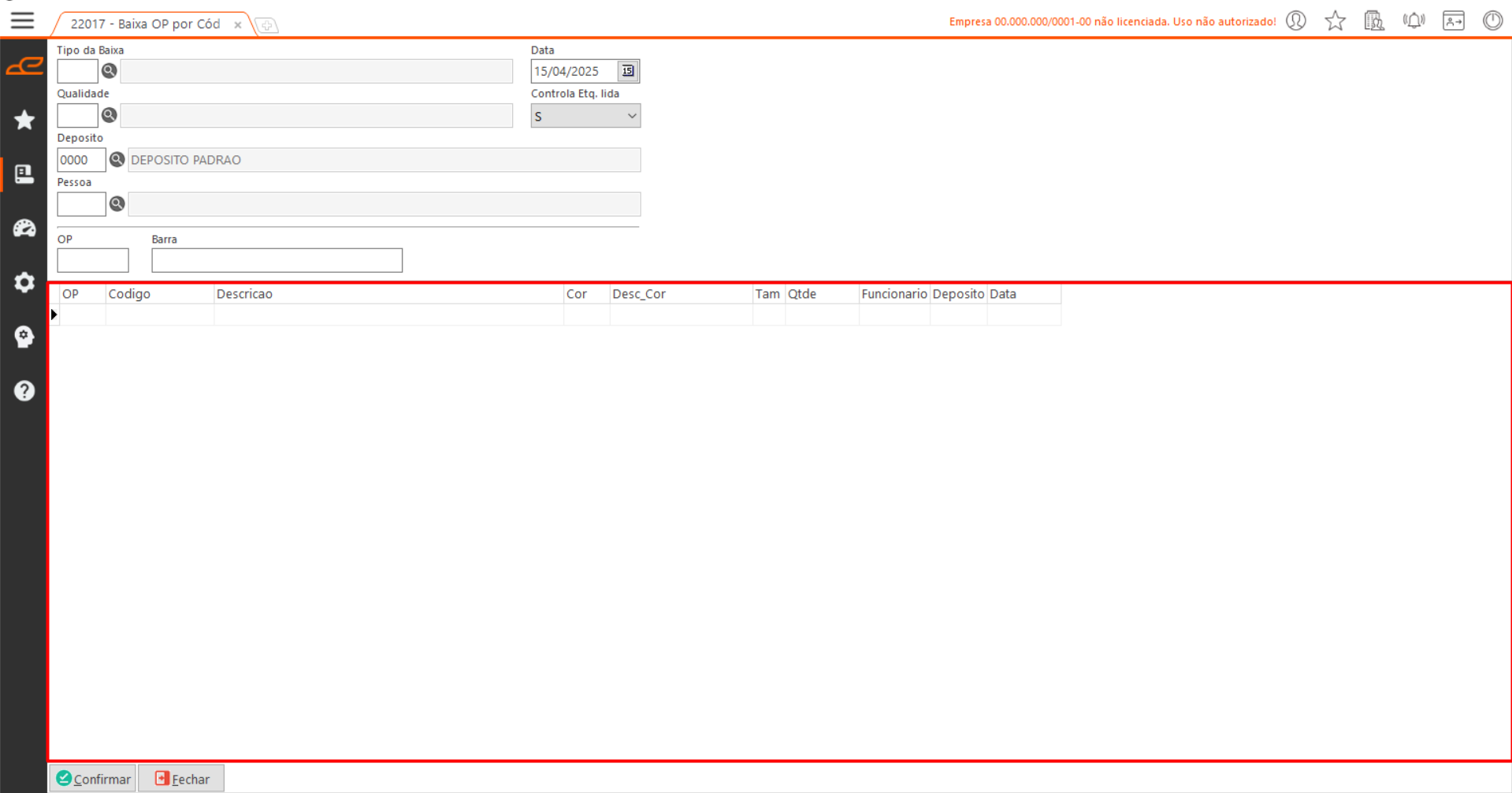 - OP: Número da OP (ordem de produção) para efetuar a baixa.