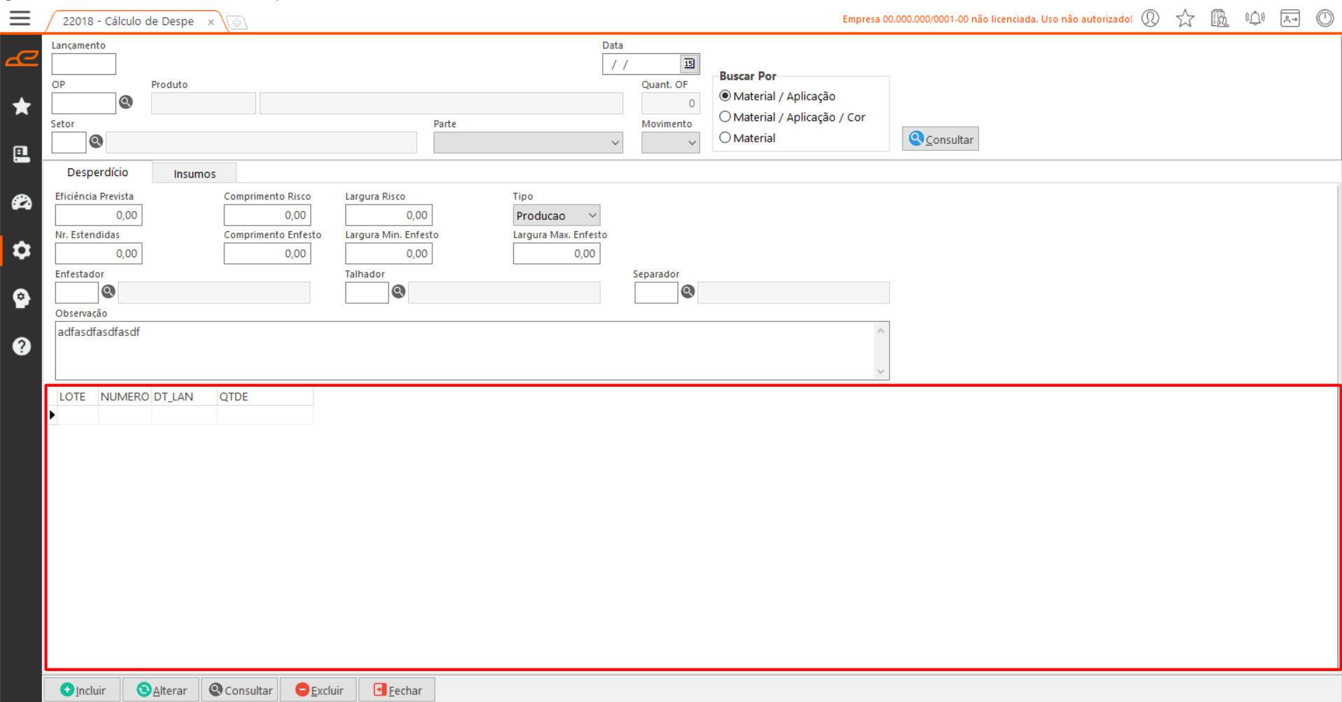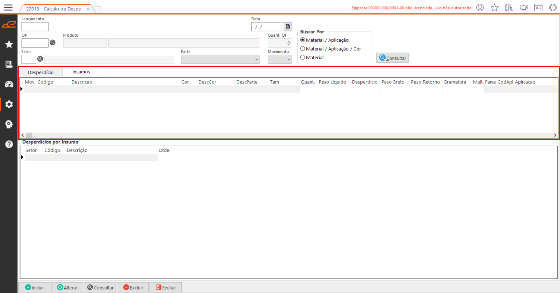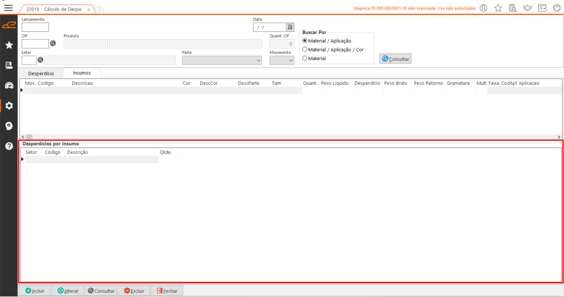 A tela “Cálculo de Desperdício” é utilizada para facilitar a análise e o gerenciamento de resíduos gerados durante os processos.