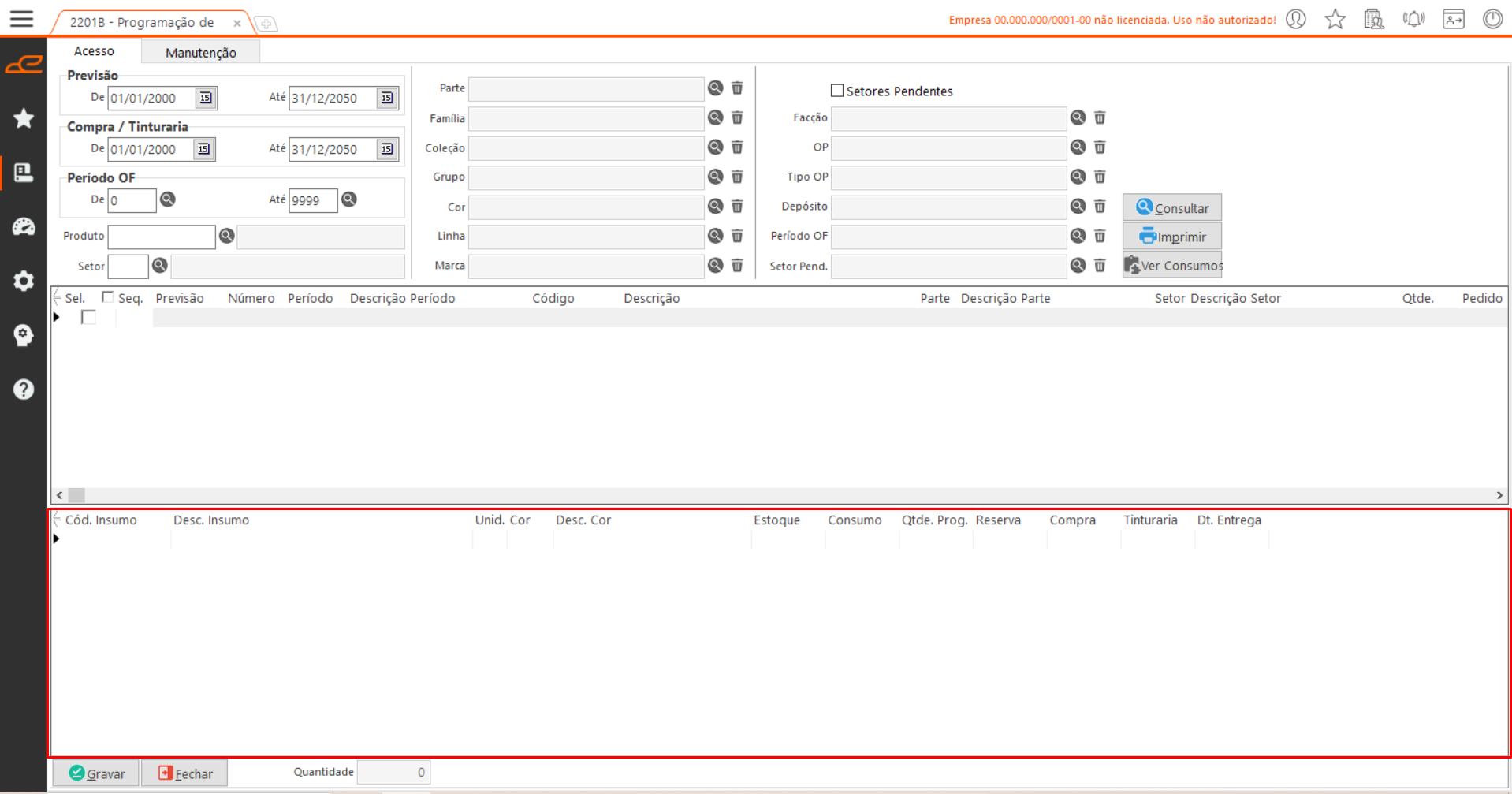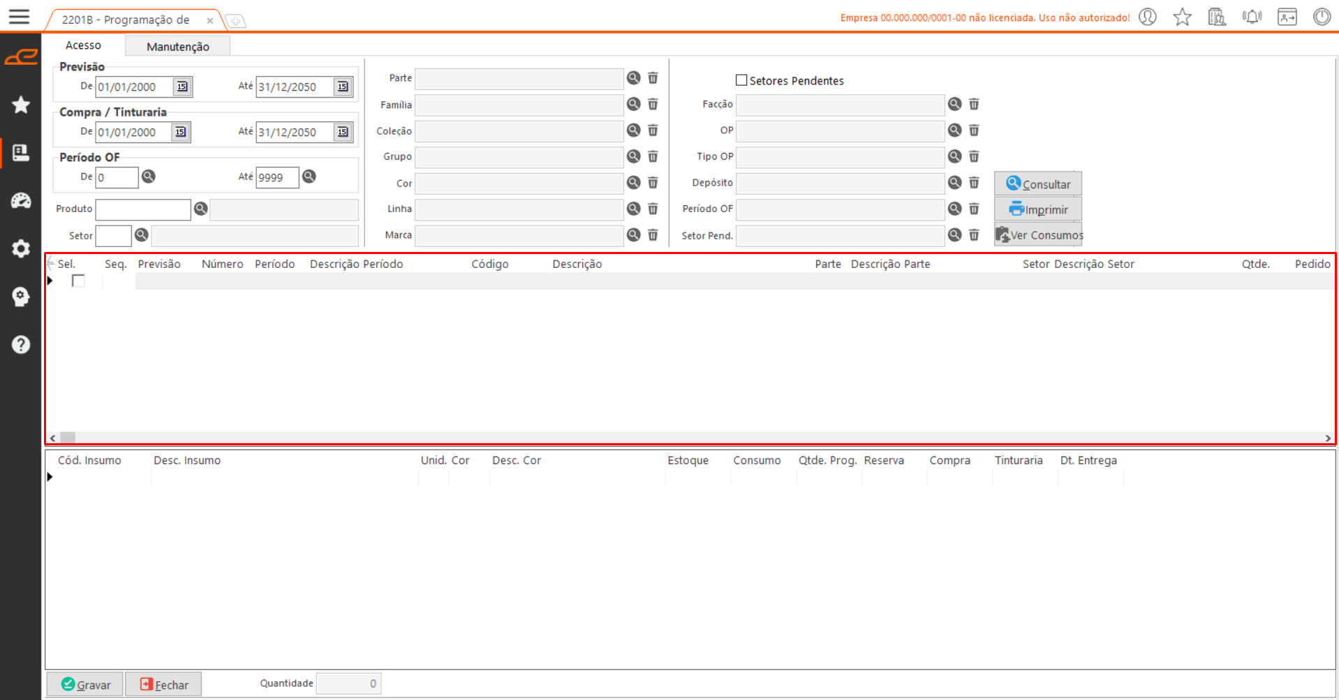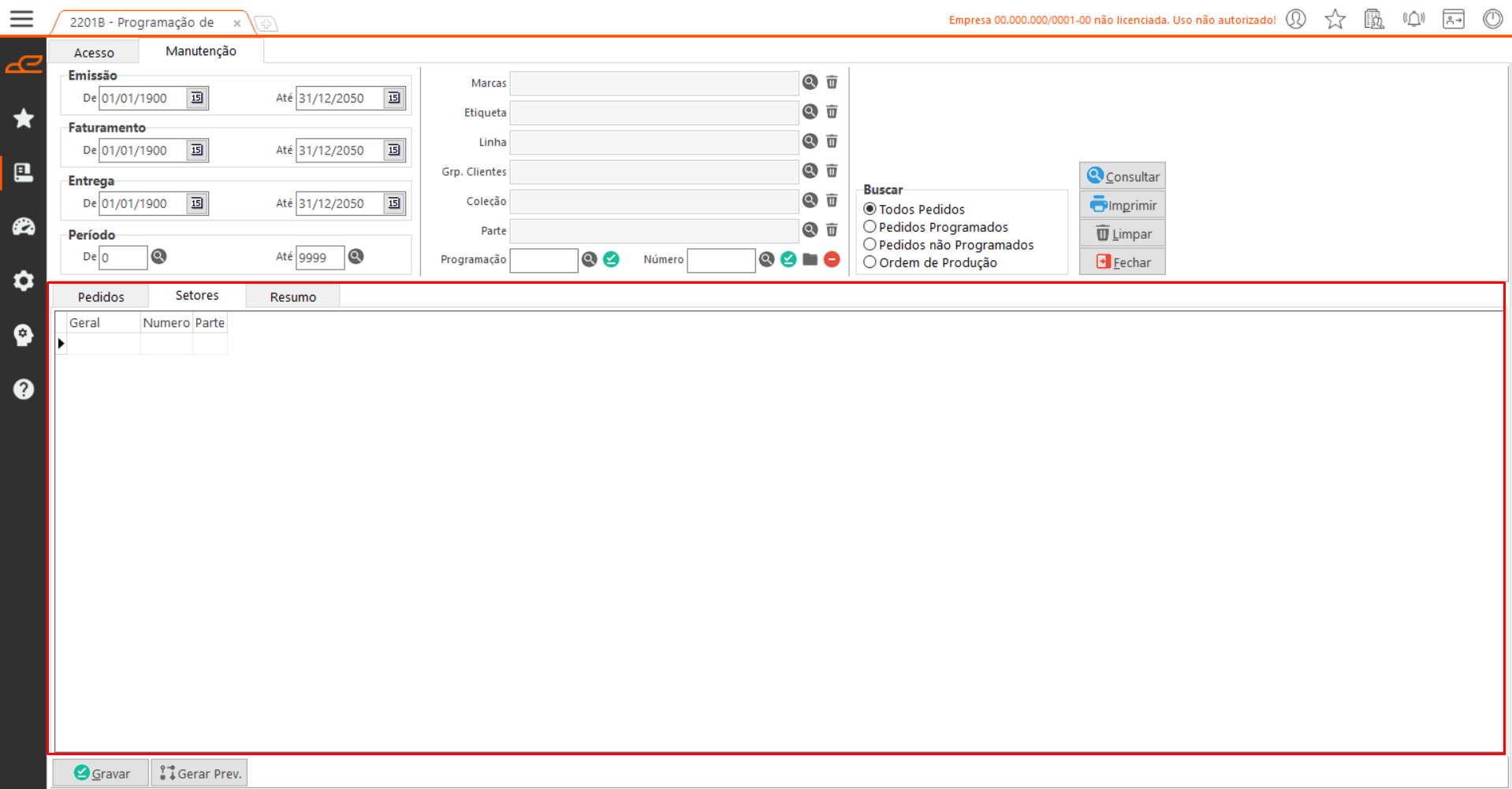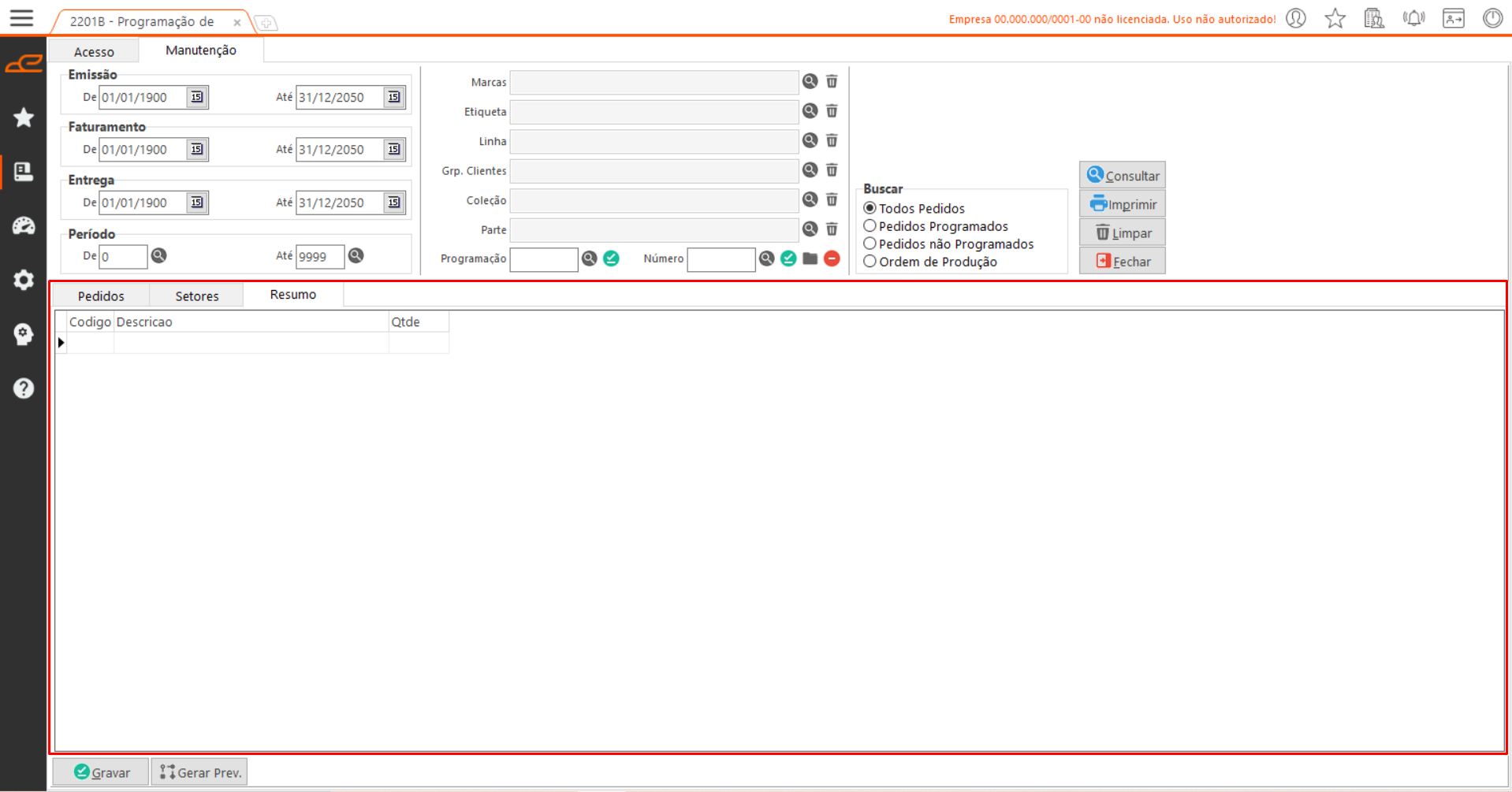 • Programação: Filtro utilizado para selecionar a programação associada a um pedido ou a uma ordem de produção. Ao lado do filtro, há um botão que, quando não há um número de programação definido, permite a geração automática de um novo número ao ser clicado.