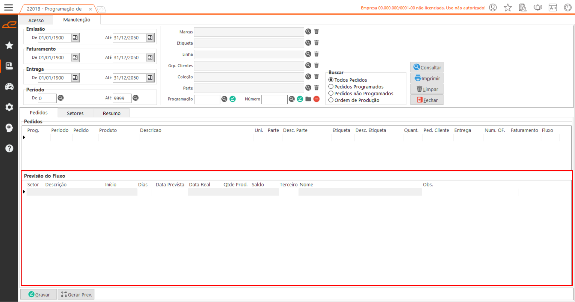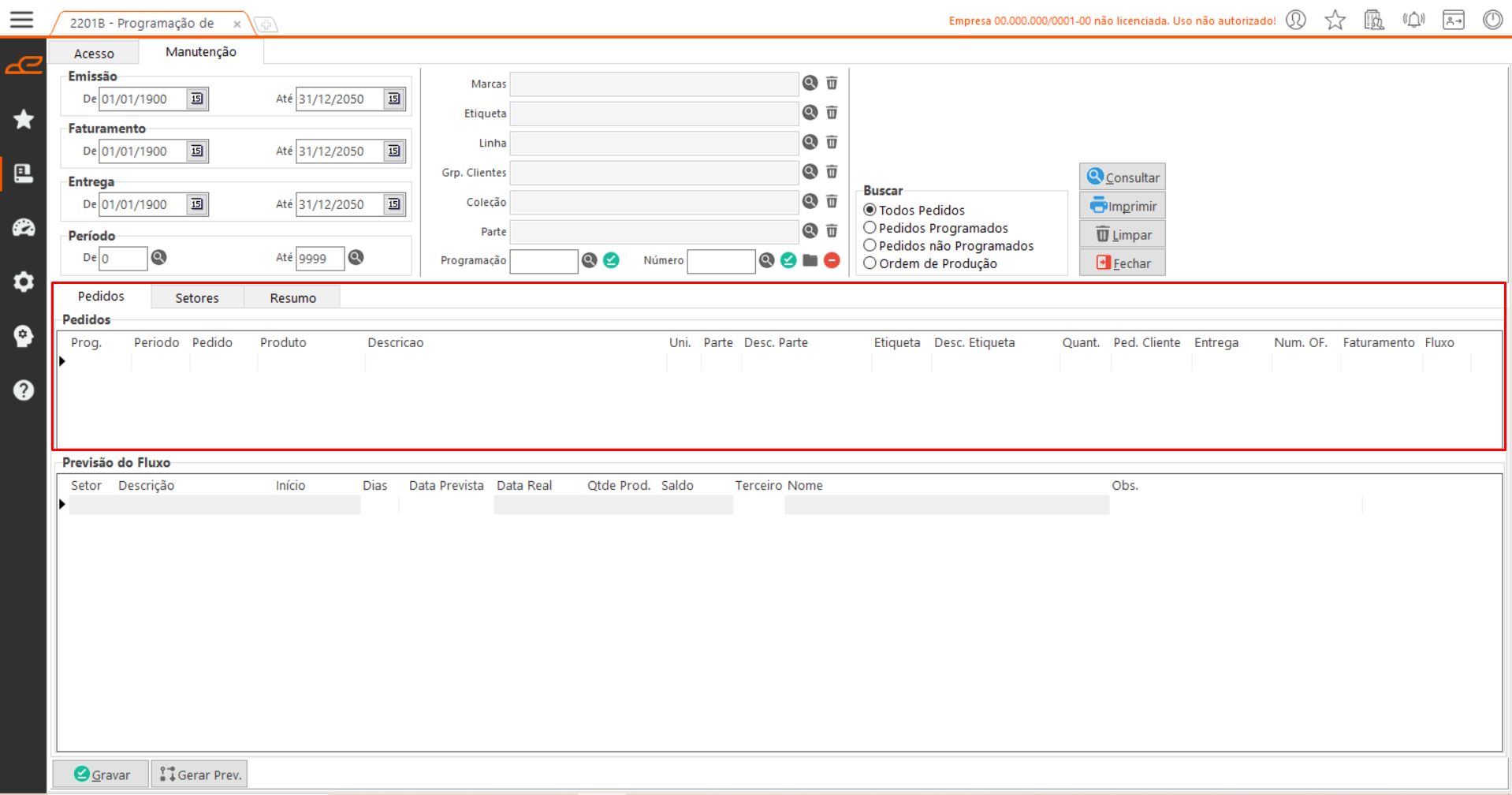 • Pedidos: Esta aba tem duas tabelas ‘Pedidos, Previsão do Fluxo‘, que tem como objetivo exibir informações, com base nos filtros informados, e permite fazer alterações para gerar a programação de uma OP com base em um pedido.