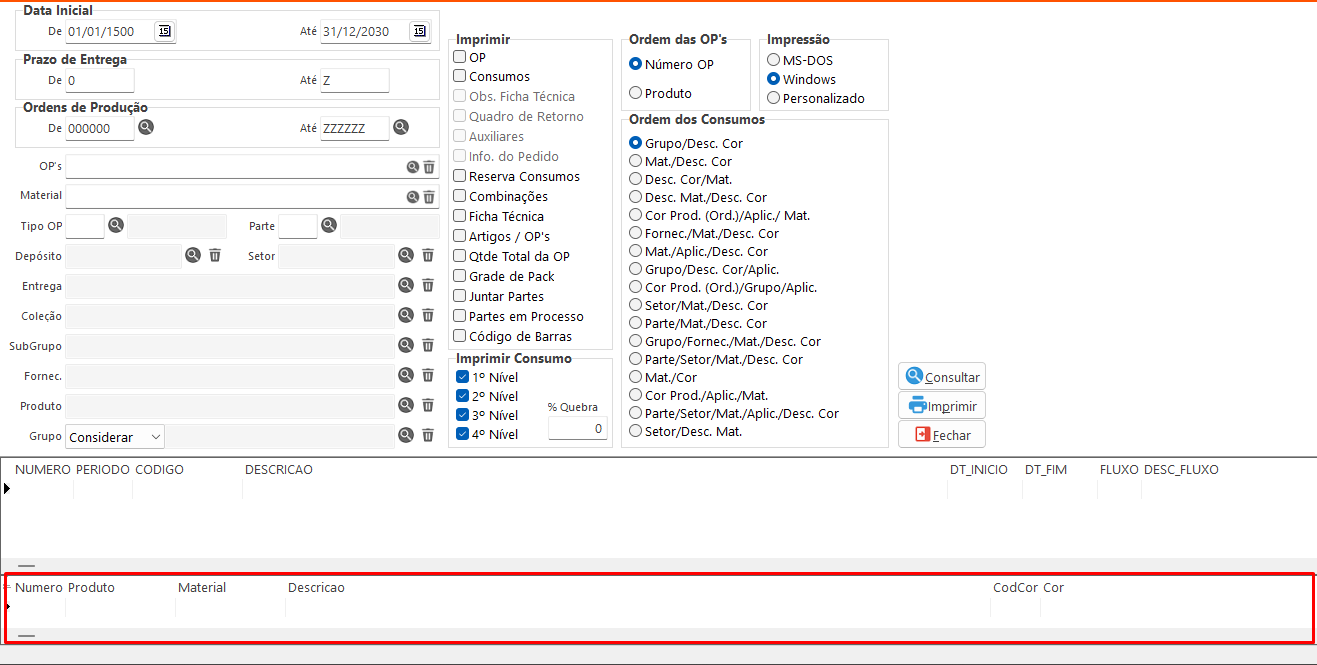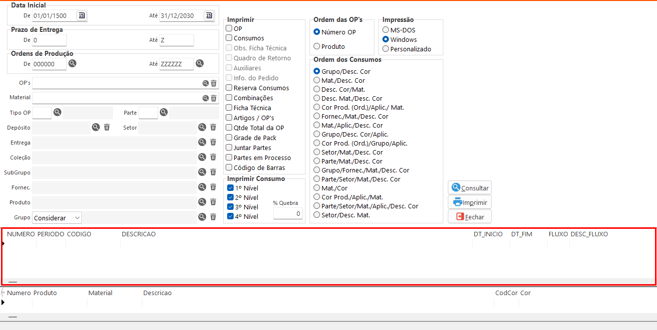 - Entrega: Informa na consulta o período da ordem de produção em formato de lista.