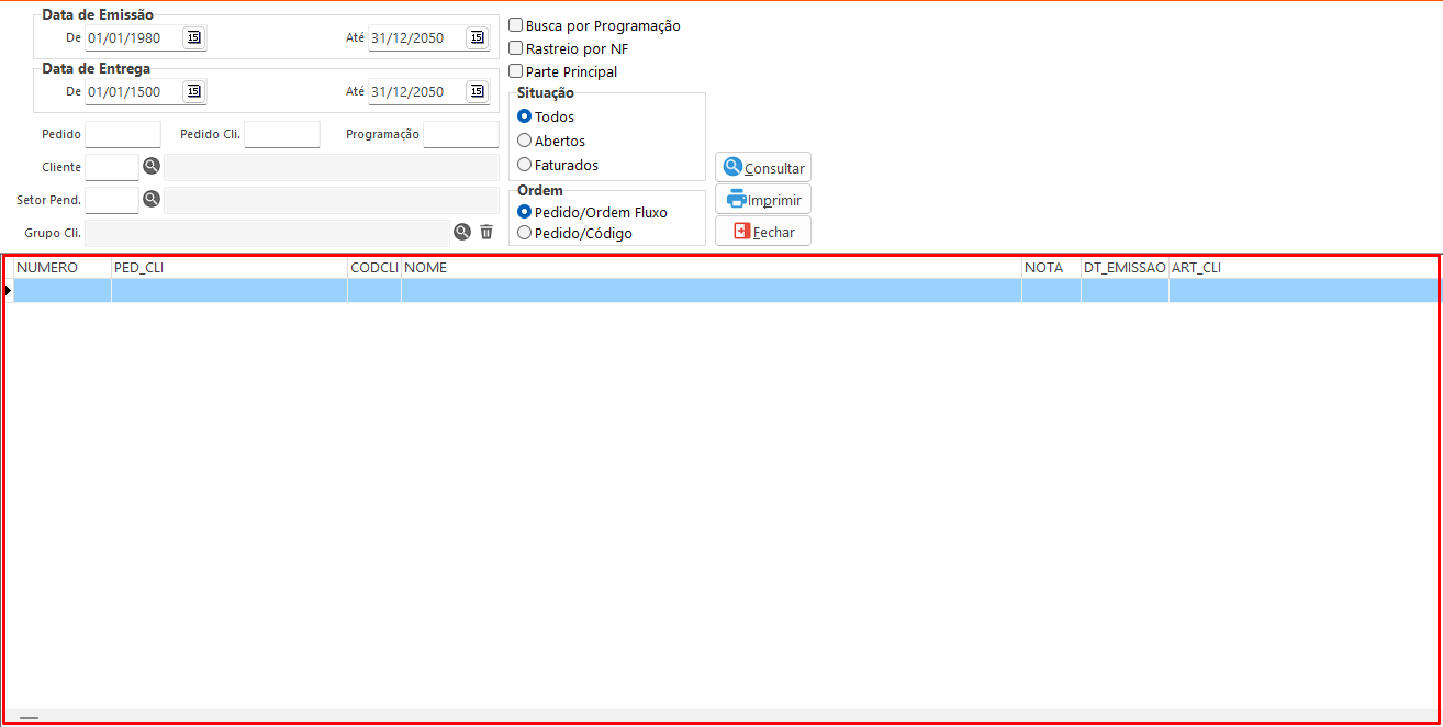 • Programação: Informa a programação vinculada ao pedido considerada na consulta.