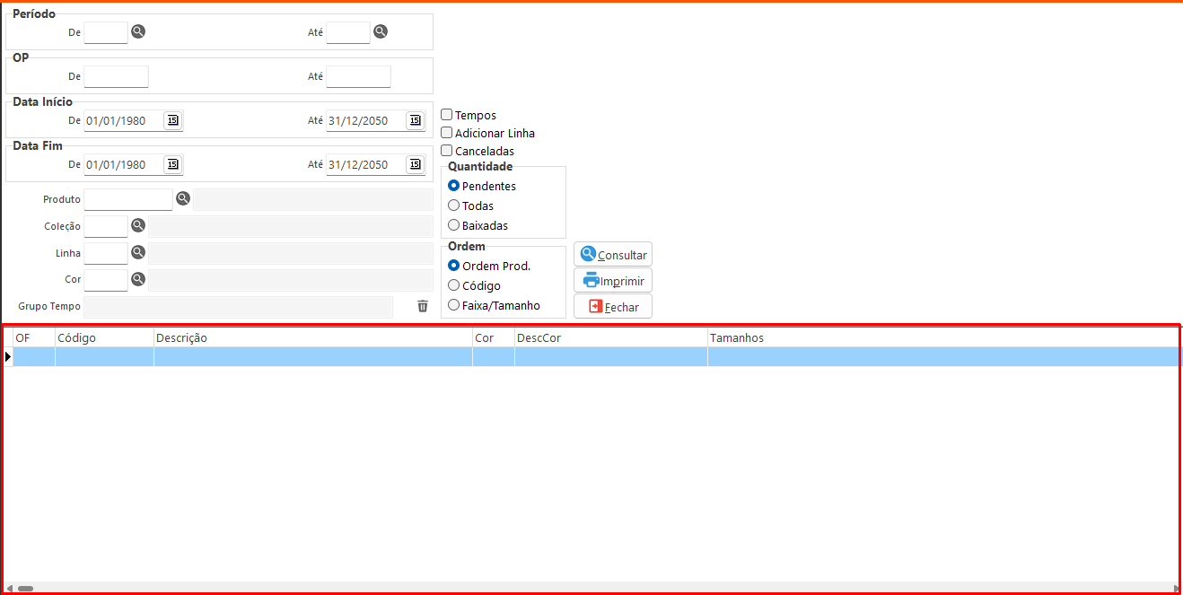 - Data Fim: Informa na consulta a data final da ordem de produção.
