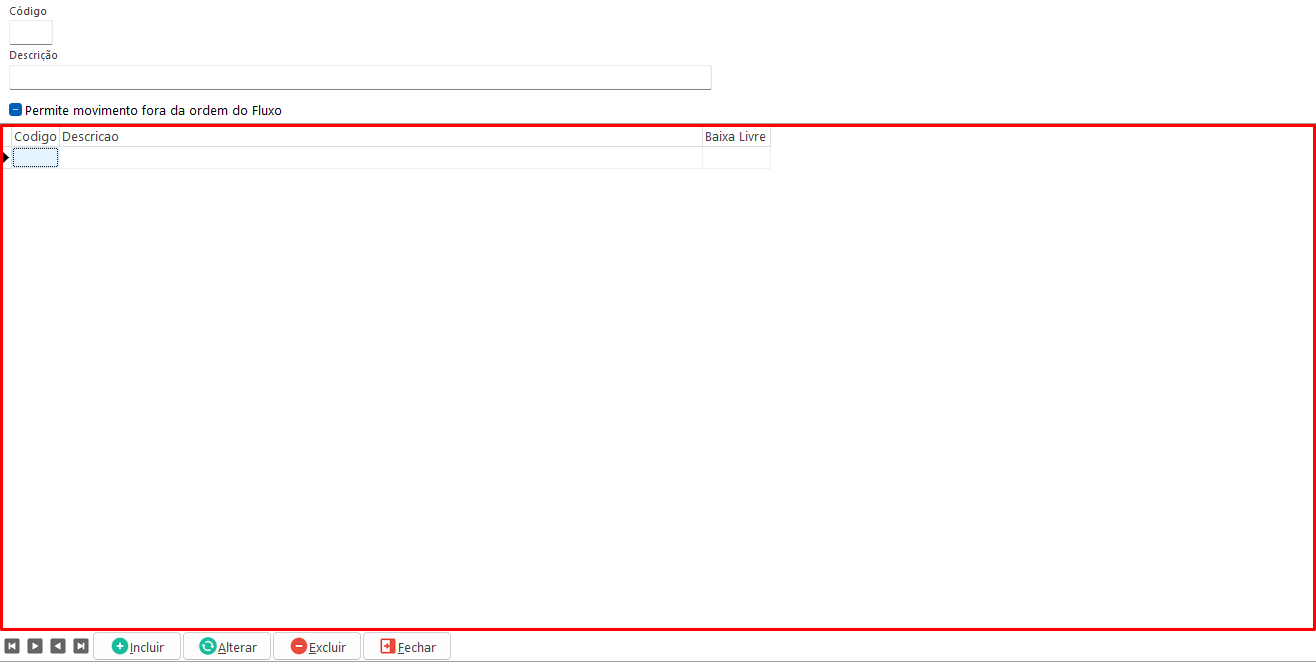 - Fluxo: Esta tabela contém os registros de Fluxo, e ao selecionar um item, as informações serão automaticamente preenchidas nos filtros.
