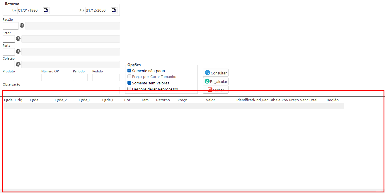 A tela Recálculo de Preços tem como objetivo permitir a consulta e a gestão das movimentações de facção, oferecendo filtros detalhados para refinar a busca e opções que facilitam a análise das informações. Além da consulta, a tela possibilita o recalculo de preços e a alteração de custos diretamente nos registros exibidos.