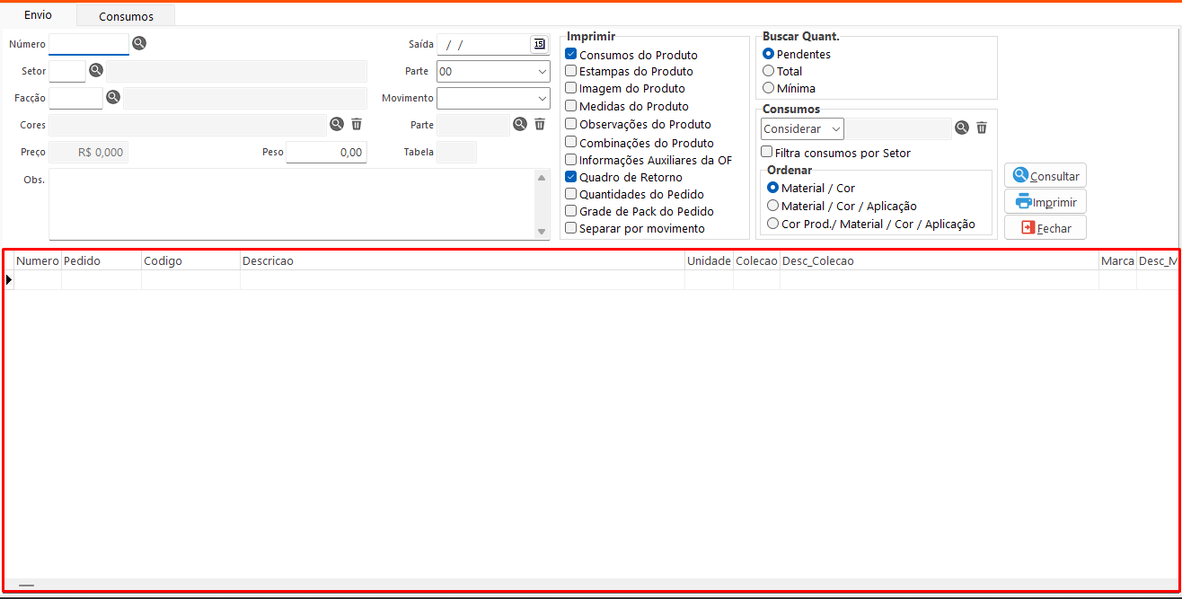 Nesta aba, é possível consultar as ordens de produção para envio ao setor, oferecendo uma visão detalhada das movimentações realizadas.