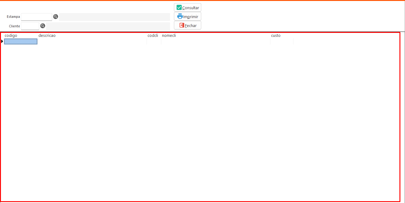 A tela De Estampas permite a consulta e impressão das informações relacionadas às estampas utilizadas por clientes.