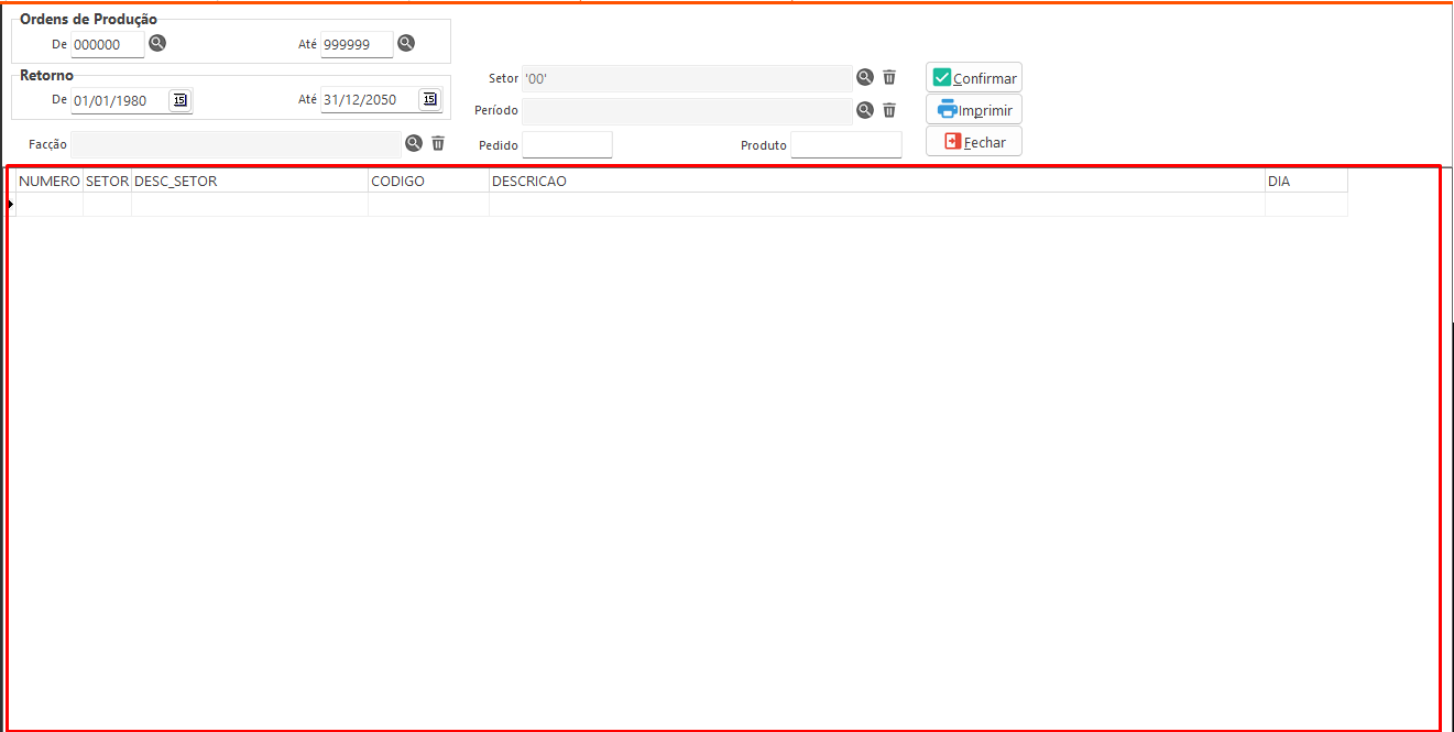 A tela De Dias por Setor tem como objetivo permitir a consulta e análise das movimentações de itens dentro do processo de facção.