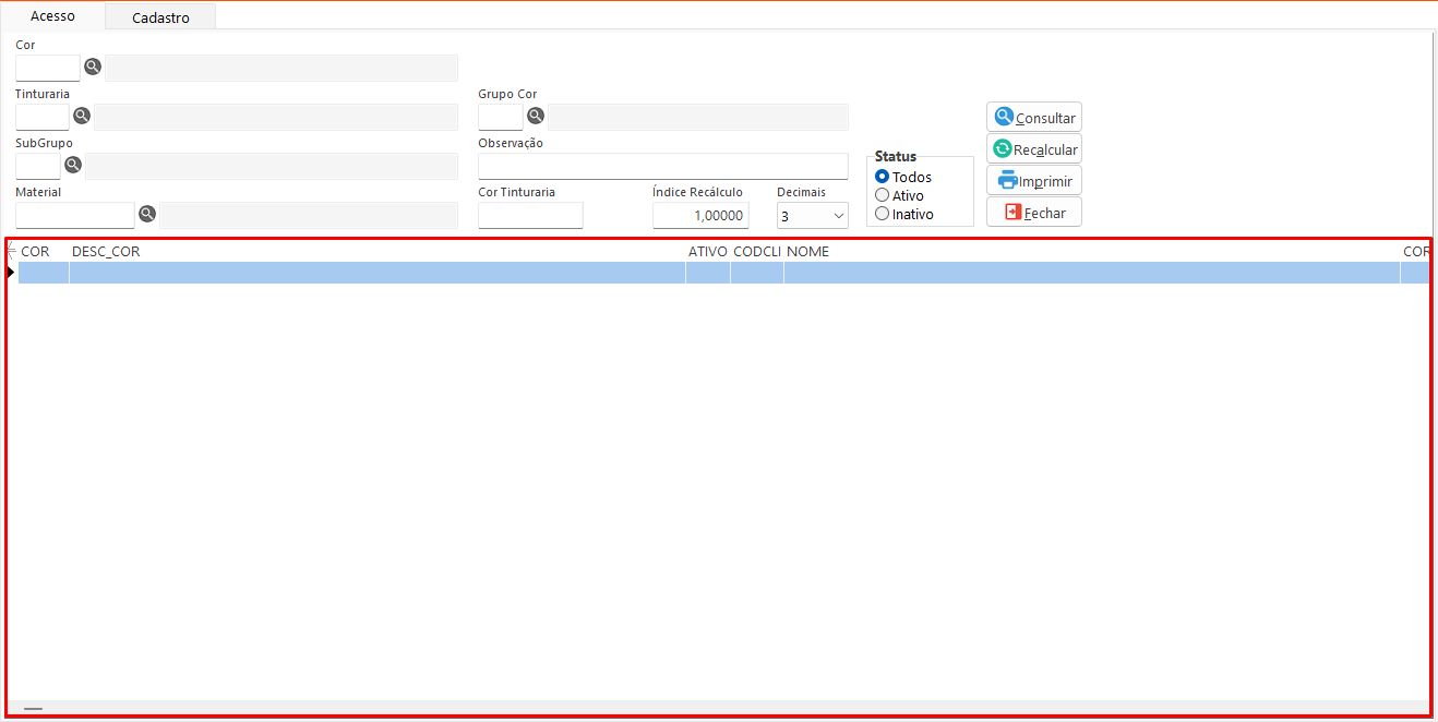 - Custo Cor: Exibe os registros de custo por cor conforme os filtros aplicados. Ao clicar duas vezes sobre um registro, as informações são carregadas na aba Cadastro para visualização ou edição.