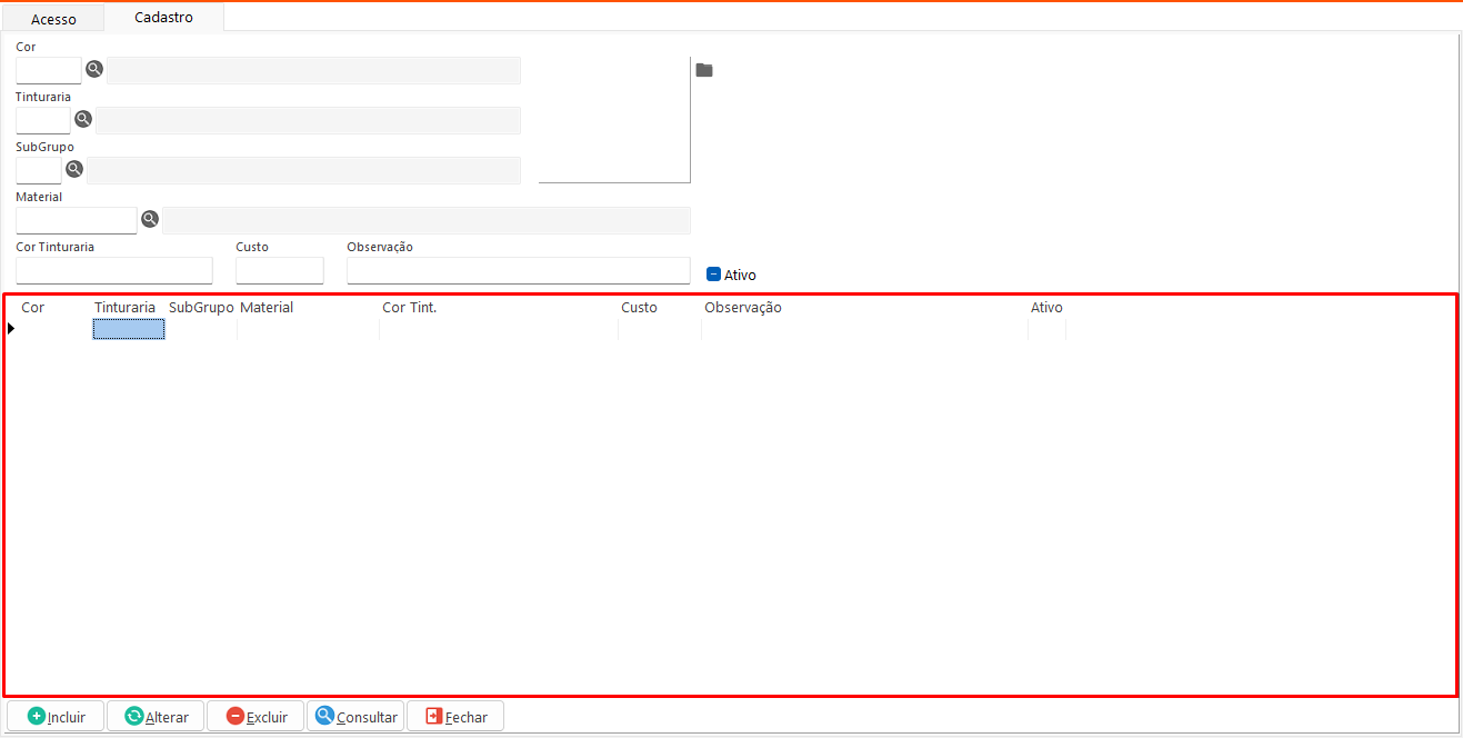 - Incluir: Habilita os filtros para cadastrar um novo custo cor.