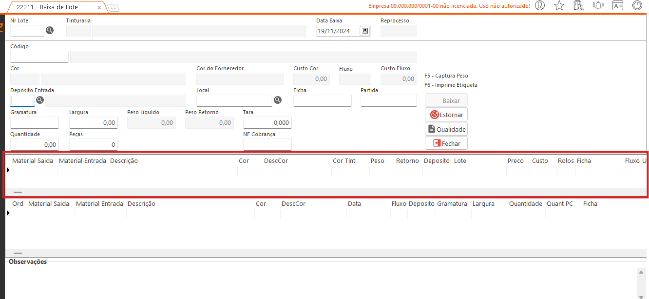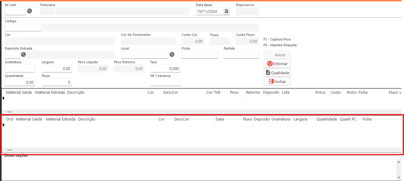 As quantidades são estornadas da tinturaria e o estoque é atualizado. As principais operações são realizadas nos campos abaixo:- Quantidade: