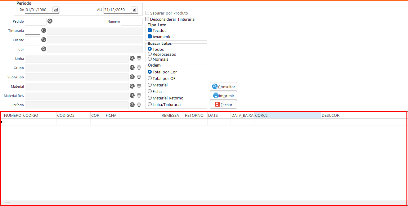 - Material Ret.: filtra pelo código do item de retorno da ordem de tinturaria.