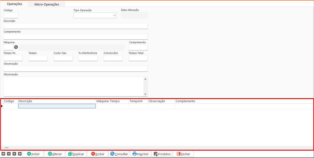 A tela Operações tem como objetivo permitir o cadastro, manutenção e consulta das operações e micro-operações relacionadas ao processo produtivo.