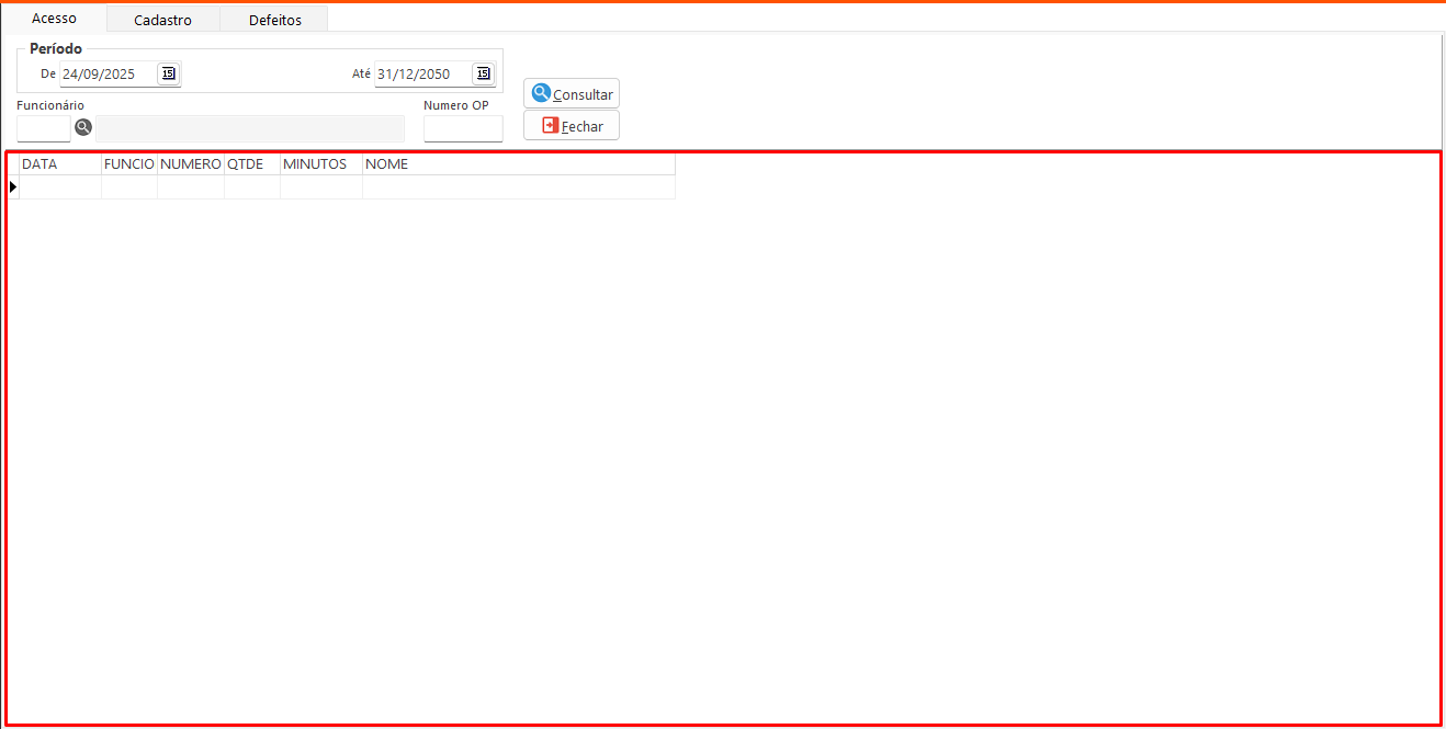 - Produção: Exibe as informações de produção por funcionário. Ao dar um duplo clique em um registro, os dados selecionados são carregados automaticamente na aba Cadastro.