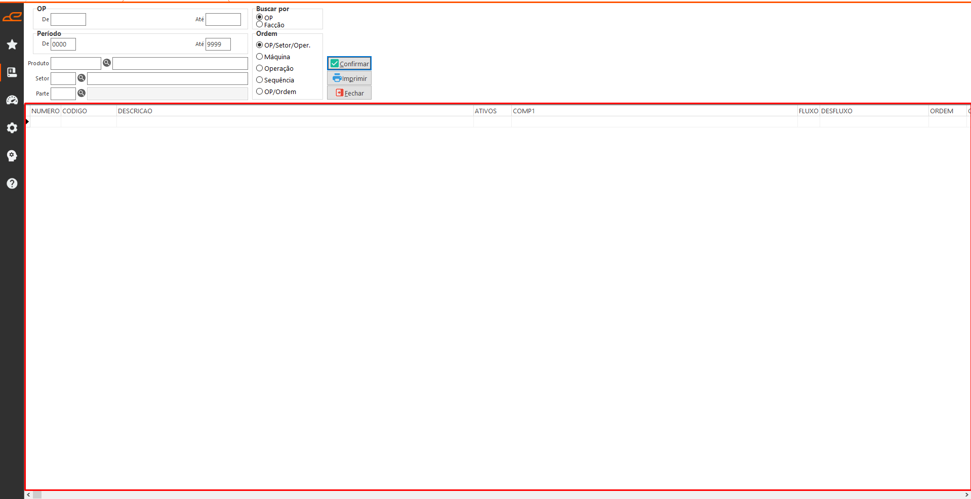 - Buscar por: Define a tabela do sistema que será feito a busca das ordens de produção.