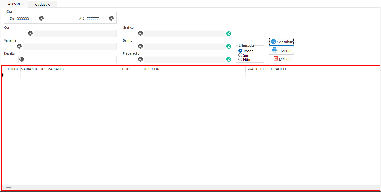 • Cor (De – Até): Define o intervalo de cores para consulta das receitas.