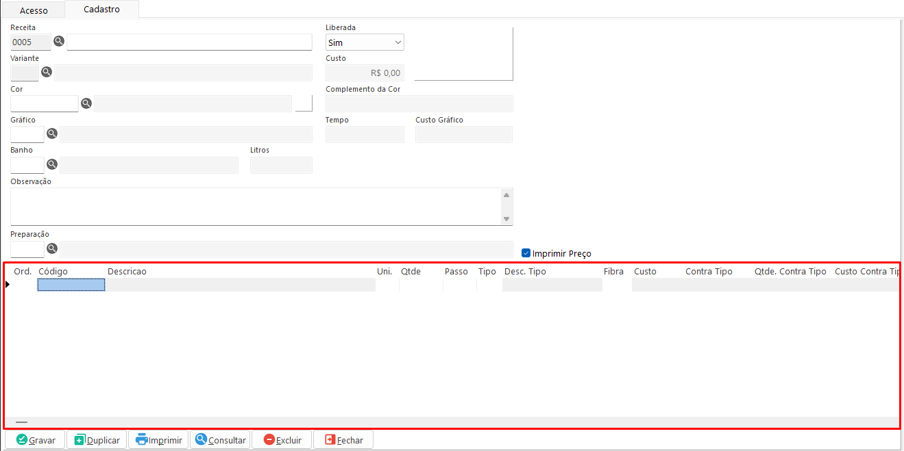 Nesta aba é possível cadastrar, alterar, duplicar e excluir receitas de cor.