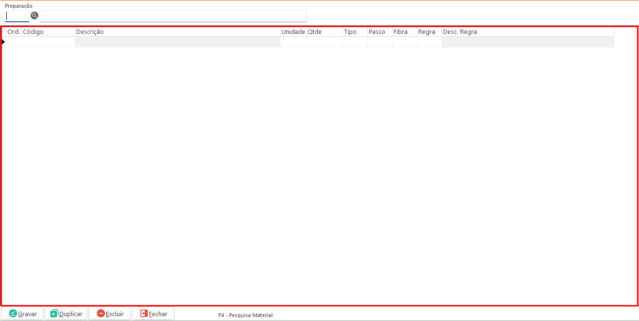 A tela Preparação tem como objetivo permitir o registro, consulta e manutenção das preparações utilizadas nas receitas do processo produtivo.
