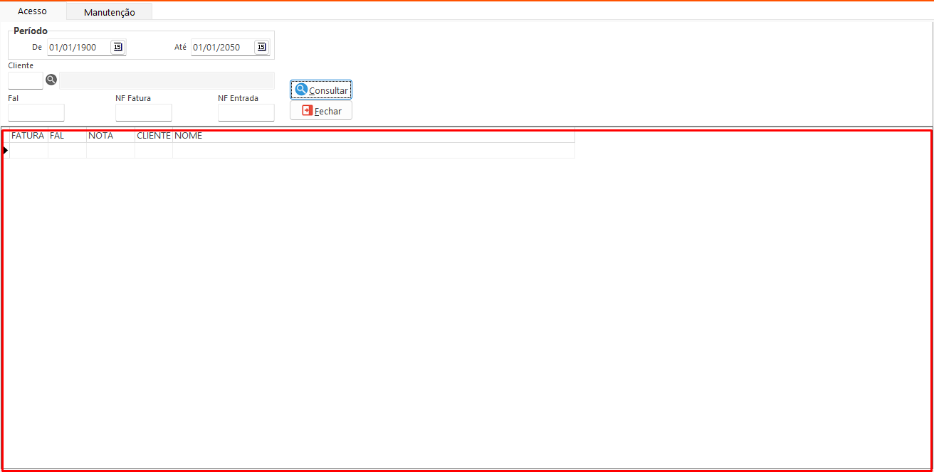 - Notas: Exibe informações das notas de tinturaria, incluindo as FAL vinculadas a cada nota. Ao dar um duplo clique em um item, os campos correspondentes na aba Manutenção são automaticamente preenchidos.