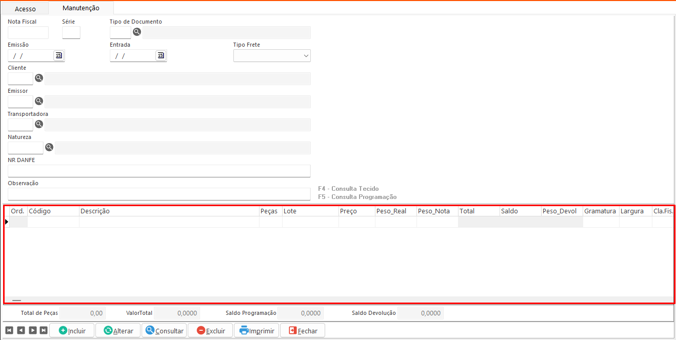 - Consultar: Abre a pesquisa para consultar uma Nota da Tinturaria existente.
