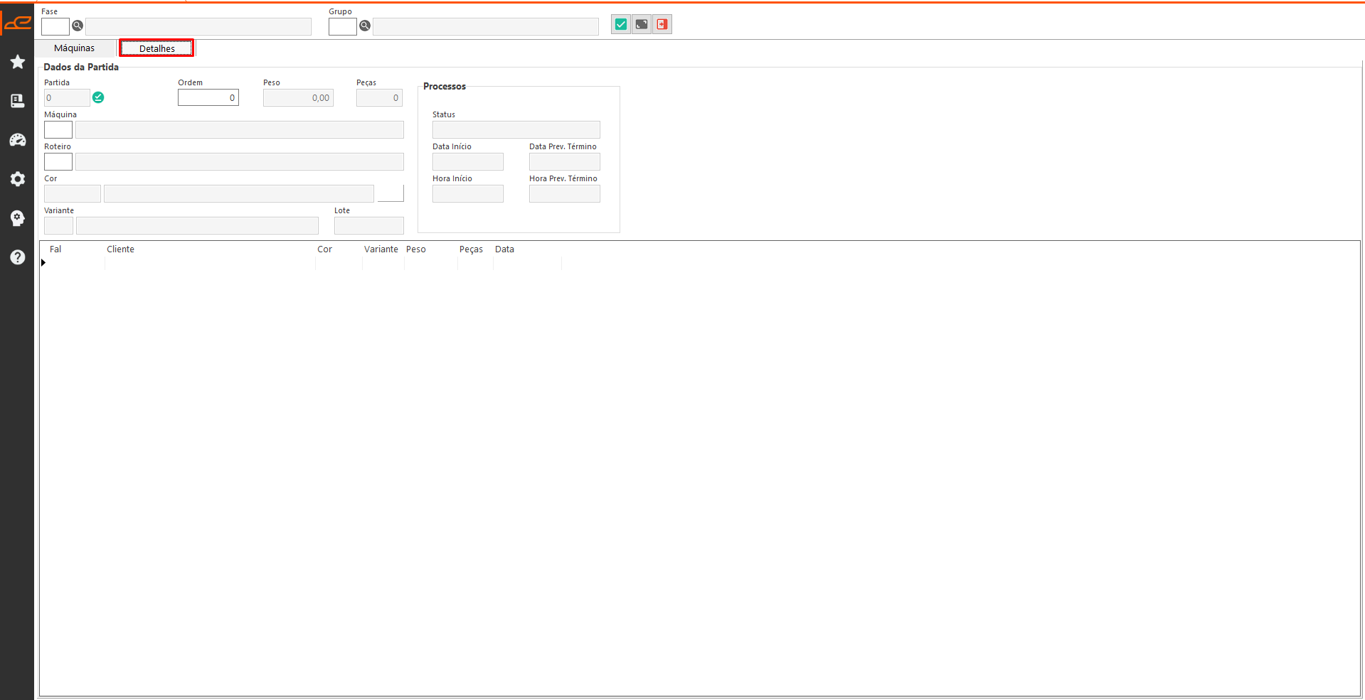 • Partida: Referente a partida definida no cadastro da FAL.