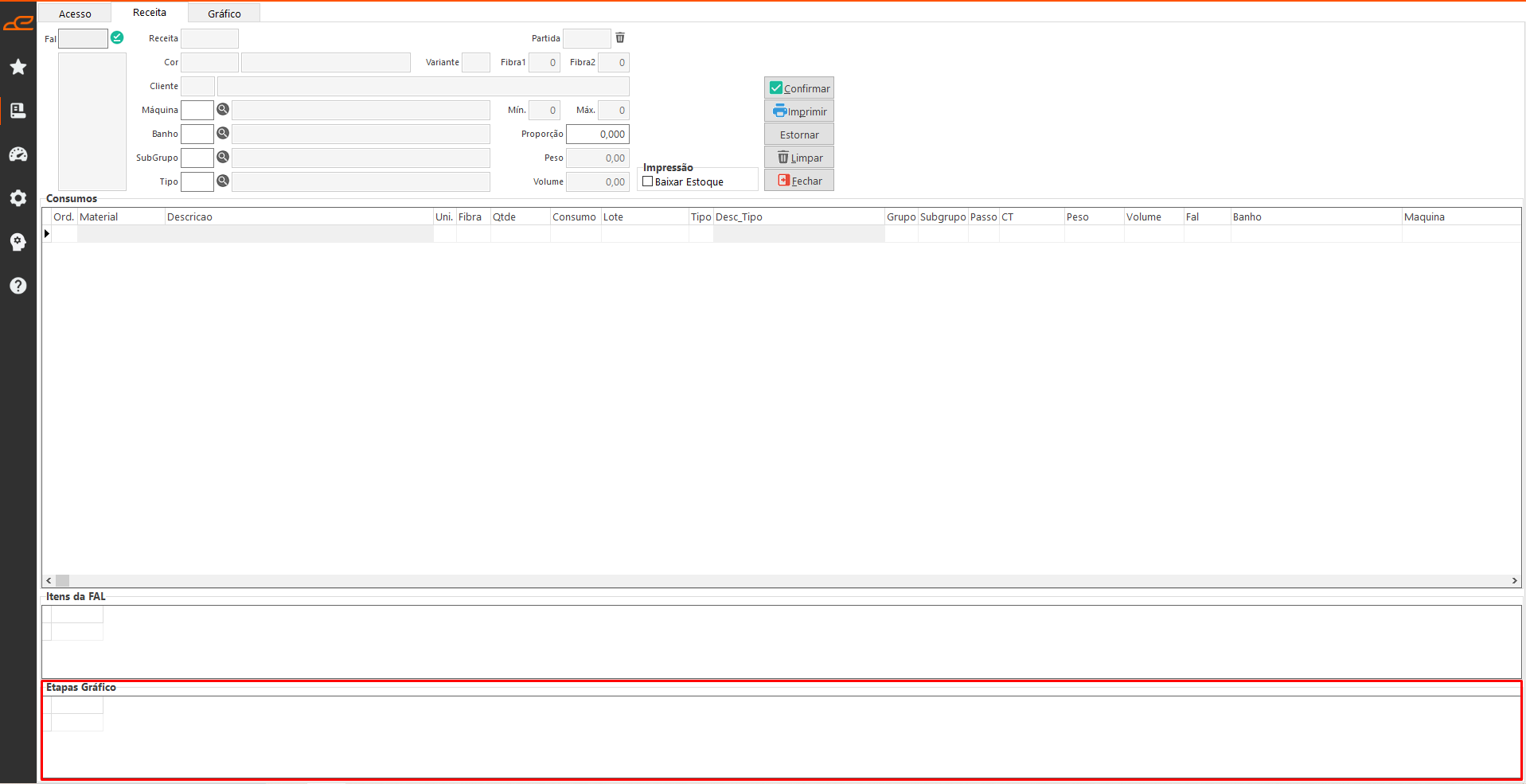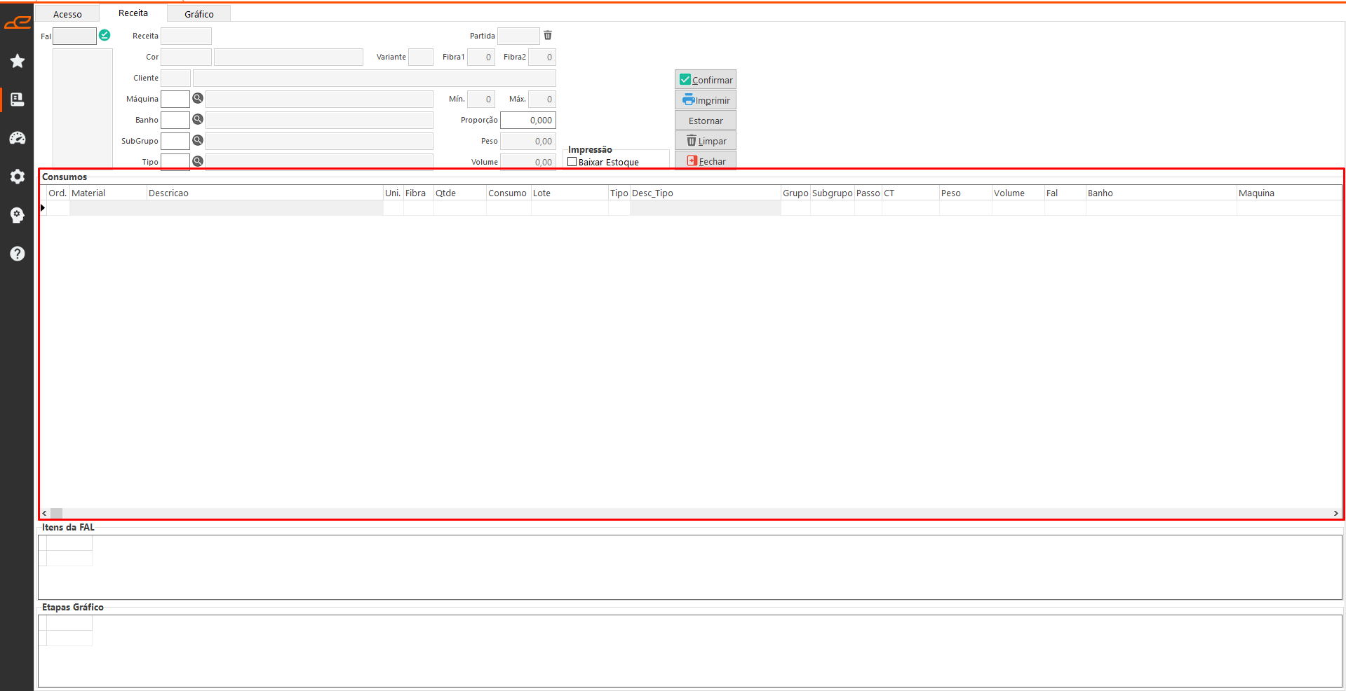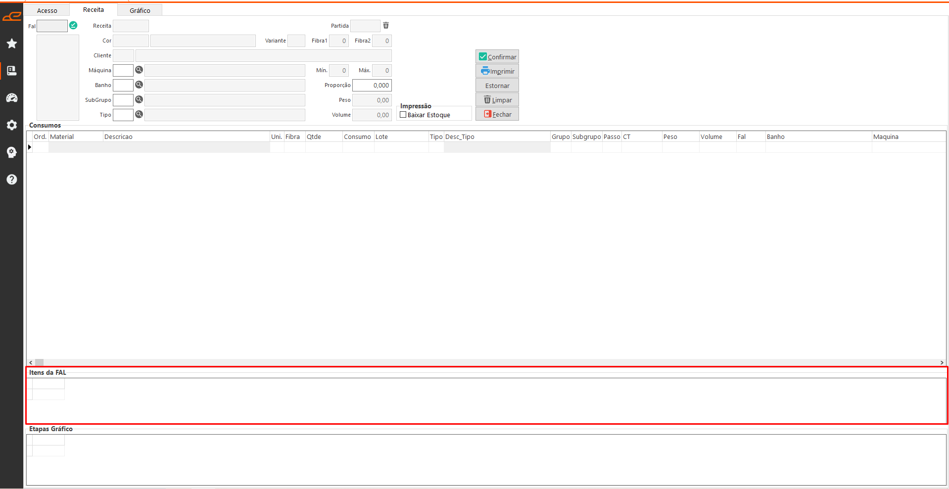 Esta aba permite imprimir as receitas referentes às FALs e realizar a baixa dos consumos relacionados à cor.