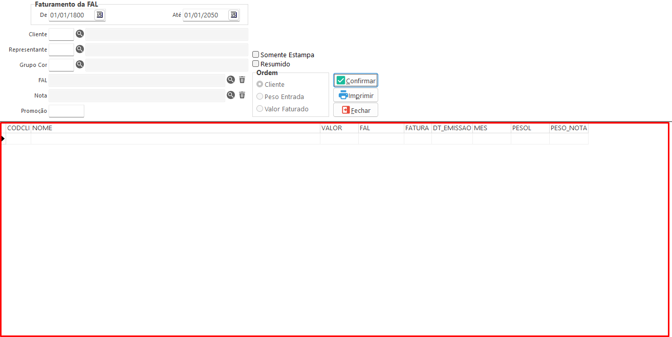 Esta tela permite consultar e emitir relatórios de notas faturadas a partir de FALs, oferecendo filtros detalhados, opções de visualização e impressão, além de exibir as informações de cada FAL associada às notas ou, no modo resumido, os totais por cliente.