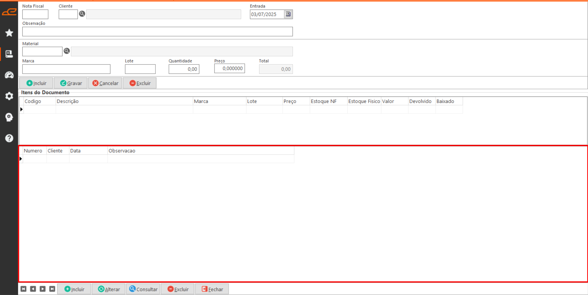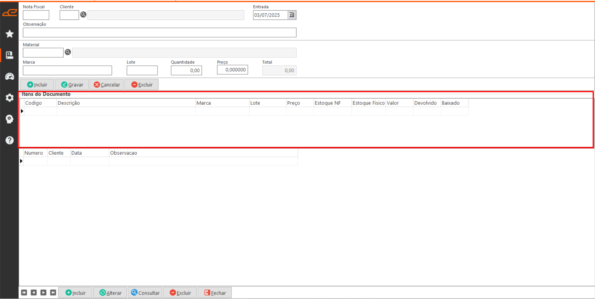 - Incluir: Permite fazer a inclusão de um material na nota fiscal de entrada.