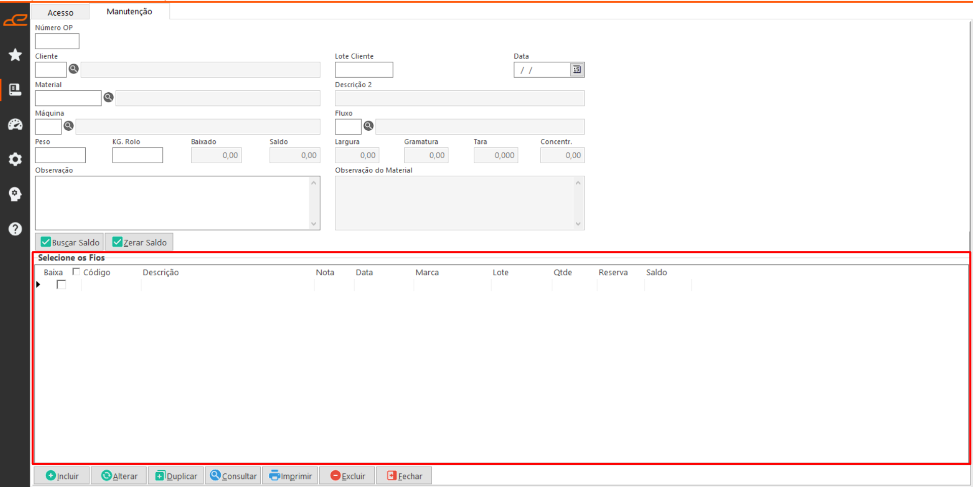 - Buscar Saldo: Permite consultar o saldo disponível do item da ordem de produção, com base nas notas fiscais de entrada vinculadas ao cliente da OP.